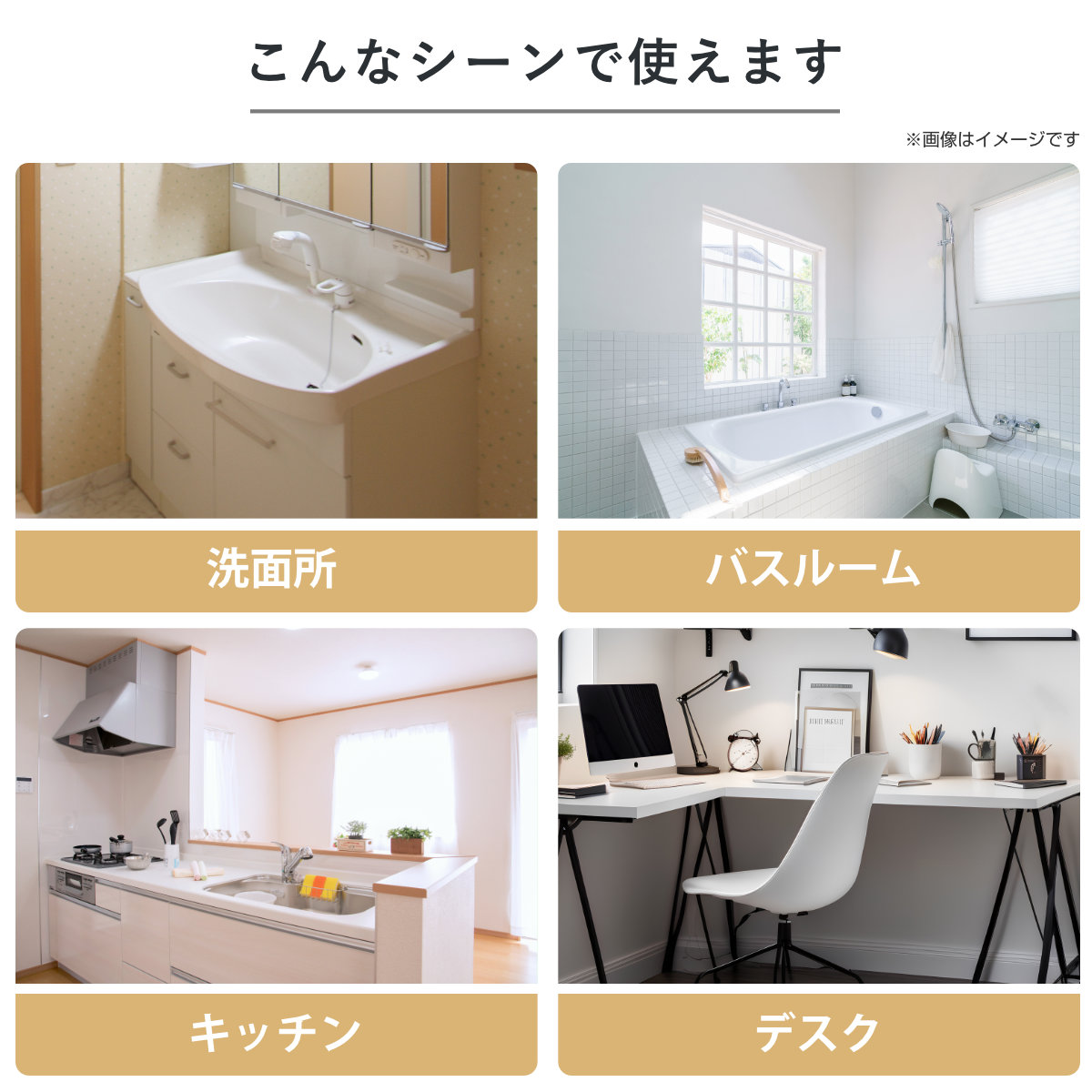 水まわりからワークスペースまでマルチに活躍します。洗面所やバスルーム、キッチン、デスクなど、さまざまなシーンでお使いいただけます。