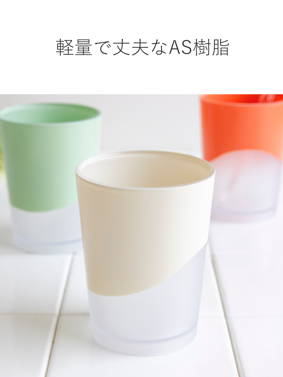 本体には、軽量で丈夫なAS樹脂を使用しています。割れにくく、適度な厚みで安定感があり、毎日のうがいや歯みがきに適しています。