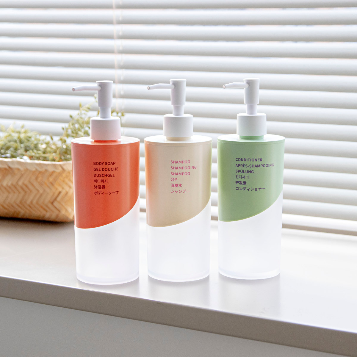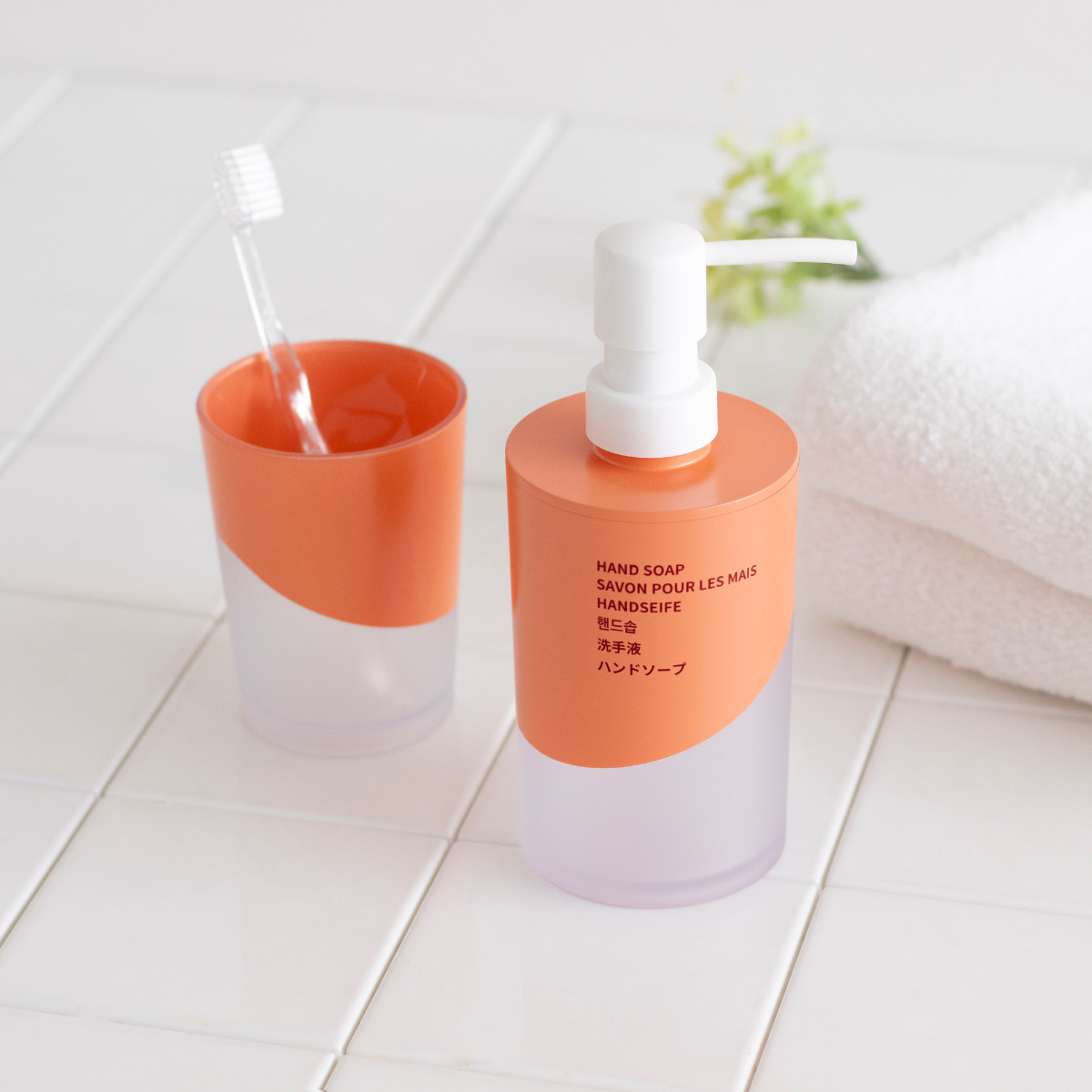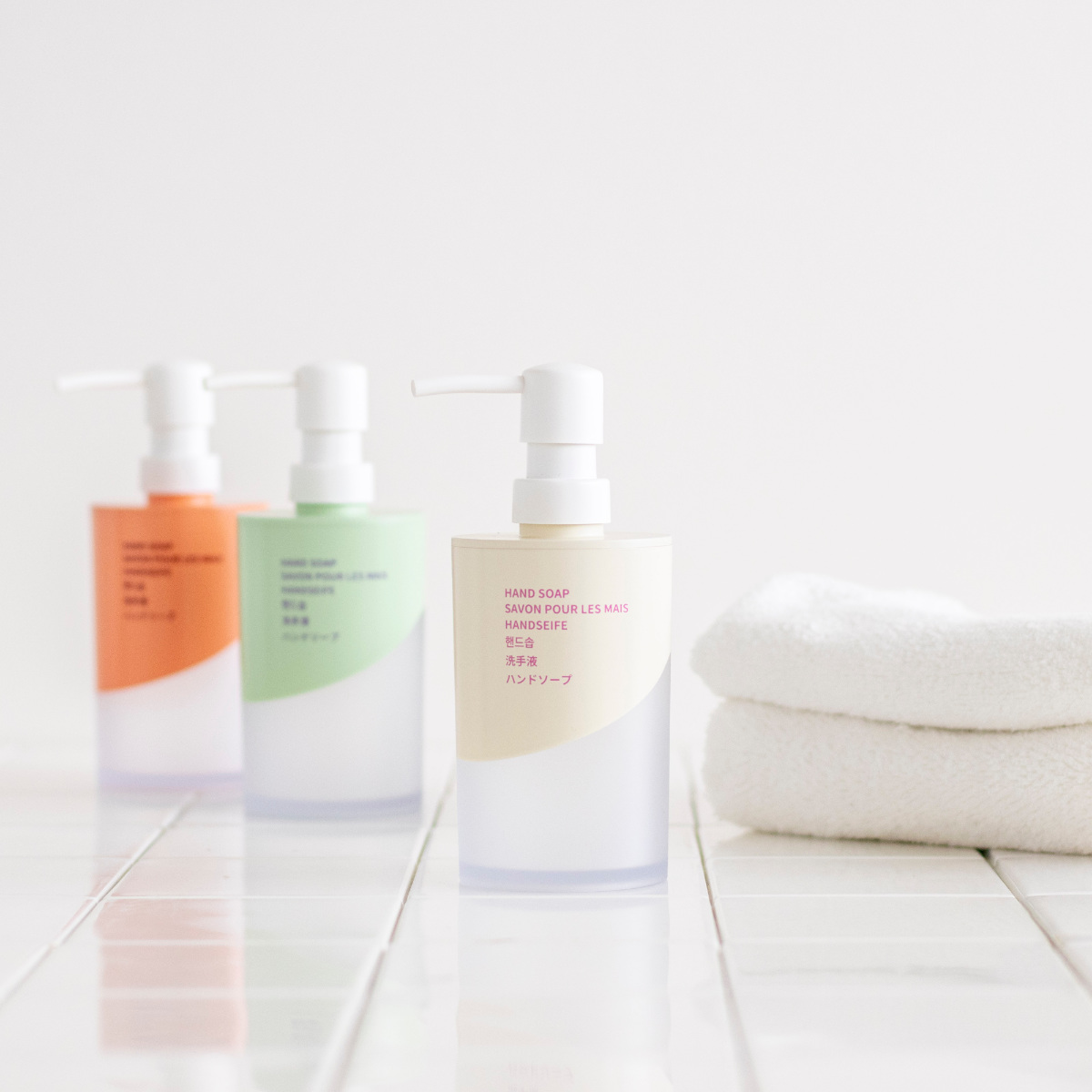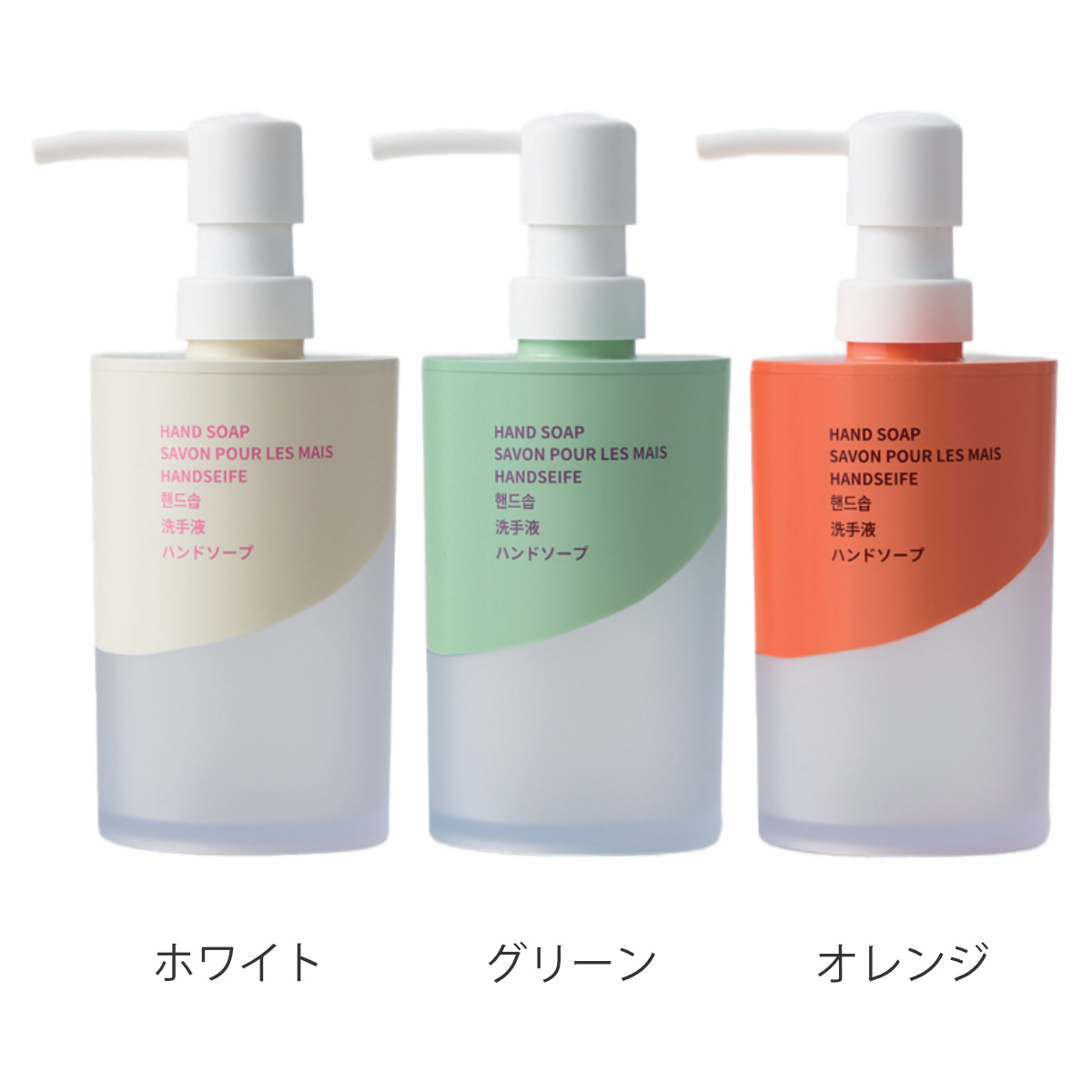 ホワイト・グリーン・オレンジの3色をご用意しました。同シリーズで揃えて使えば、洗面台に統一感と清潔感を演出できます。シャンプー・コンディショナー・ボディソープも展開。水まわりをトータルでコーディネートできます。