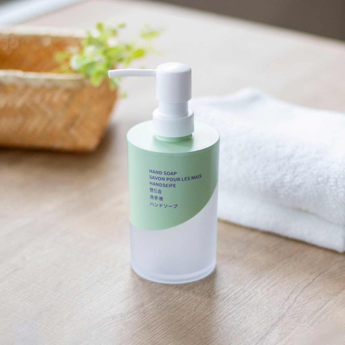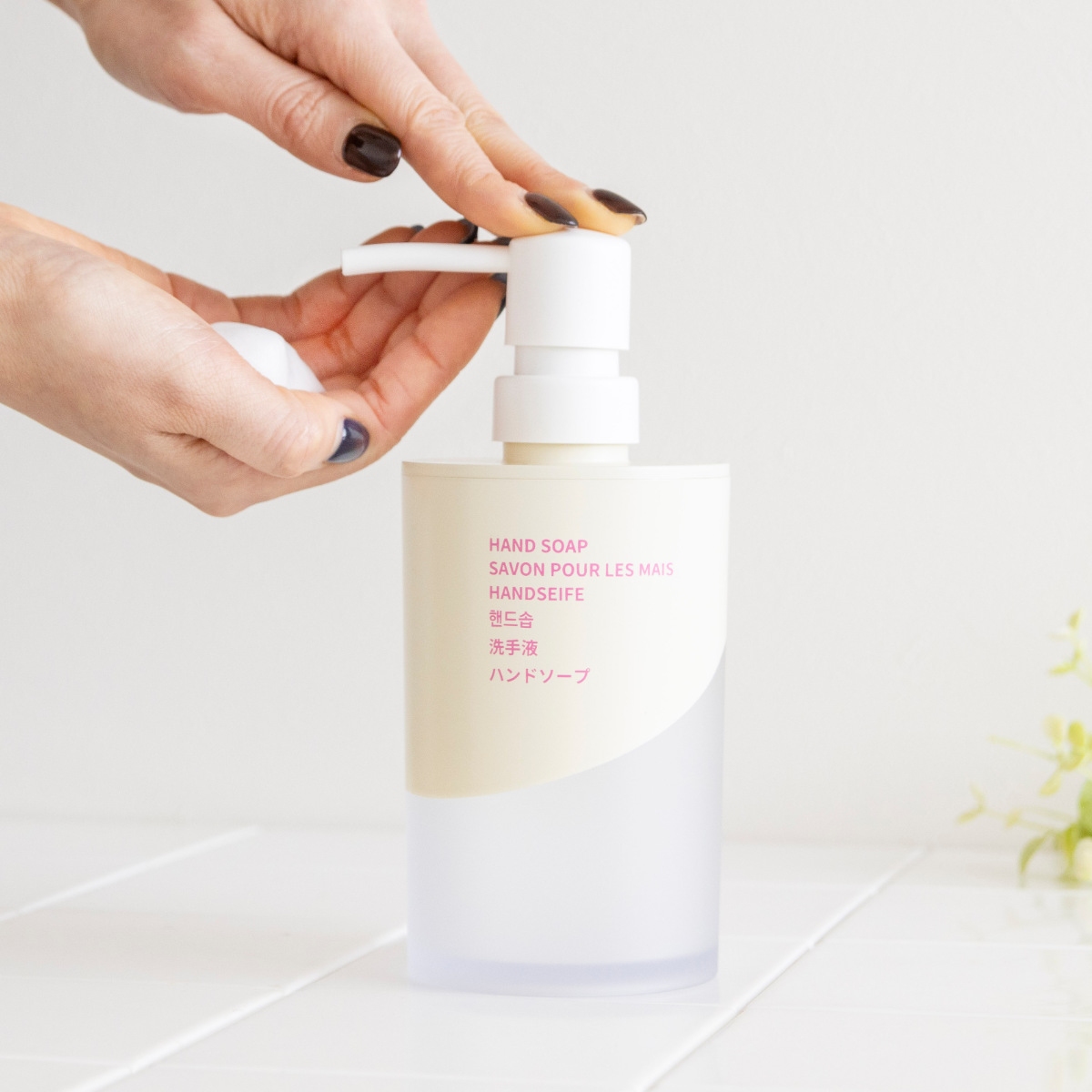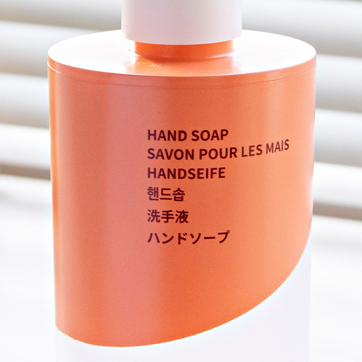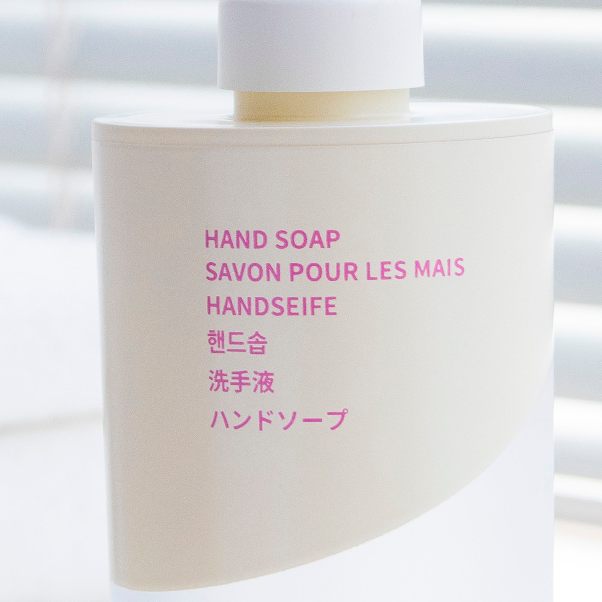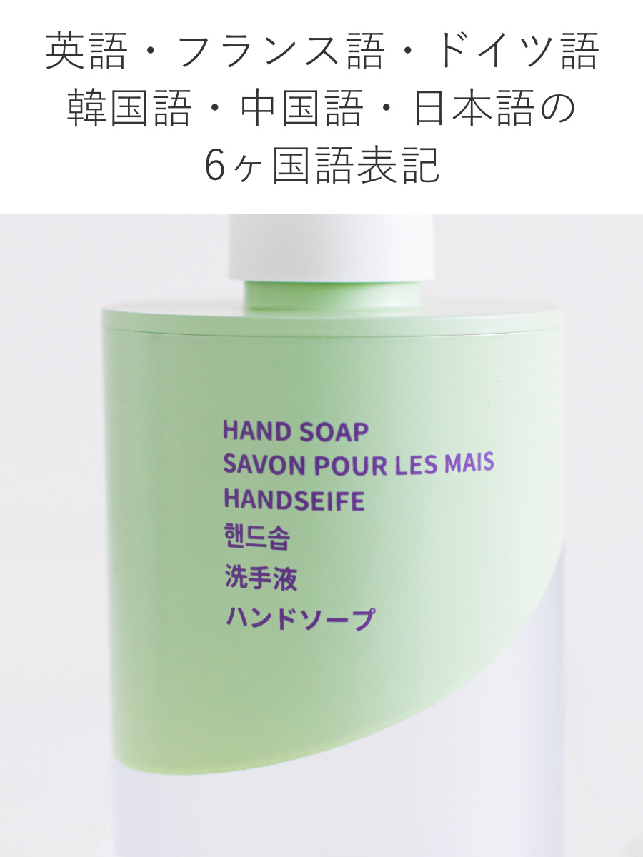 ボトルには6ヶ国語表記を採用しています。英語・フランス語・ドイツ語・韓国語・中国語・日本語で「HAND SOAP」が書かれています。デザインのアクセントとしても映え、洗面空間をさりげなくおしゃれに演出します。