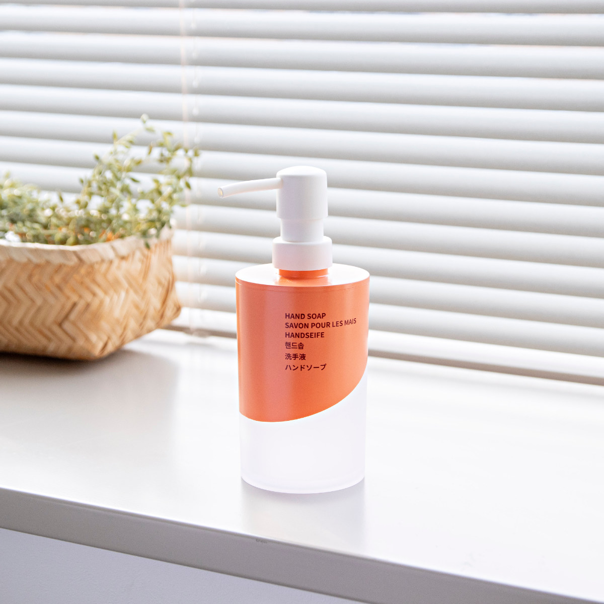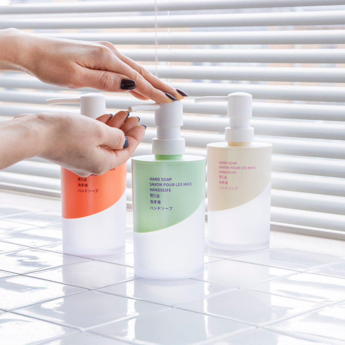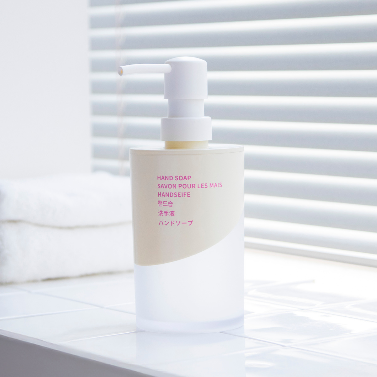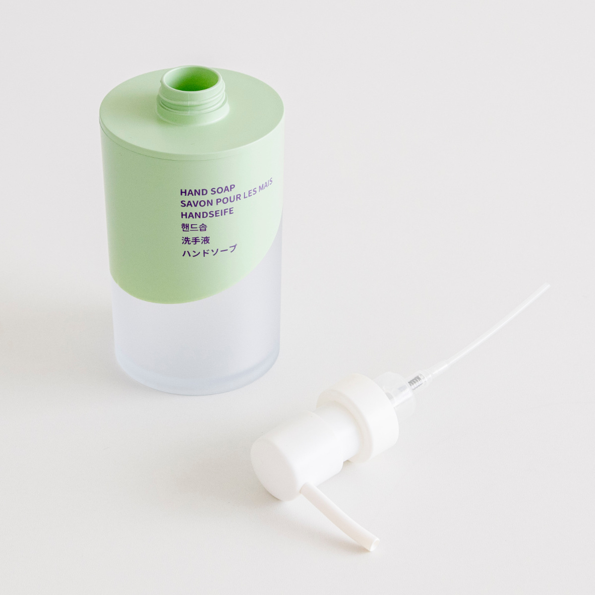 ボトルには6ヶ国語表記を採用しています。英語・フランス語・ドイツ語・韓国語・中国語・日本語で「HAND SOAP」が書かれています。デザインのアクセントとしても映え、洗面空間をさりげなくおしゃれに演出します。