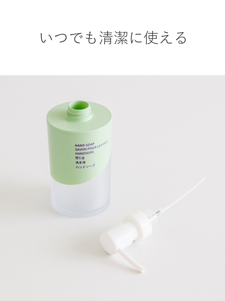 ポンプ部分は取り外しできます。細かいところまでお手入れしやすく、いつでも清潔にお使いいただけます。下部はほんのり半透明です。ソープの残量がひと目で確認できて便利です。毎日使うものだからこそ、使いやすさと清潔さに配慮しました。