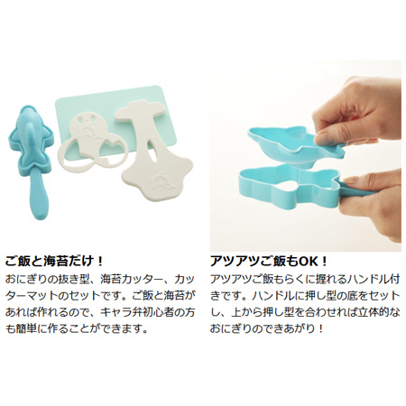 ![]() ご飯と海苔だけ! おにぎりの抜き型、海苔カッター、カッターマットのセットです。ご飯と海苔があれば作れるので、キャラ弁初心者の方も簡単に作ることができます。 | ![]() アツアツご飯もOK! アツアツご飯もらくに握れるハンドル付きです。ハンドルに押し型の底をセットし、上から押し型を合わせれば立体的なおにぎりのできあがり! | |