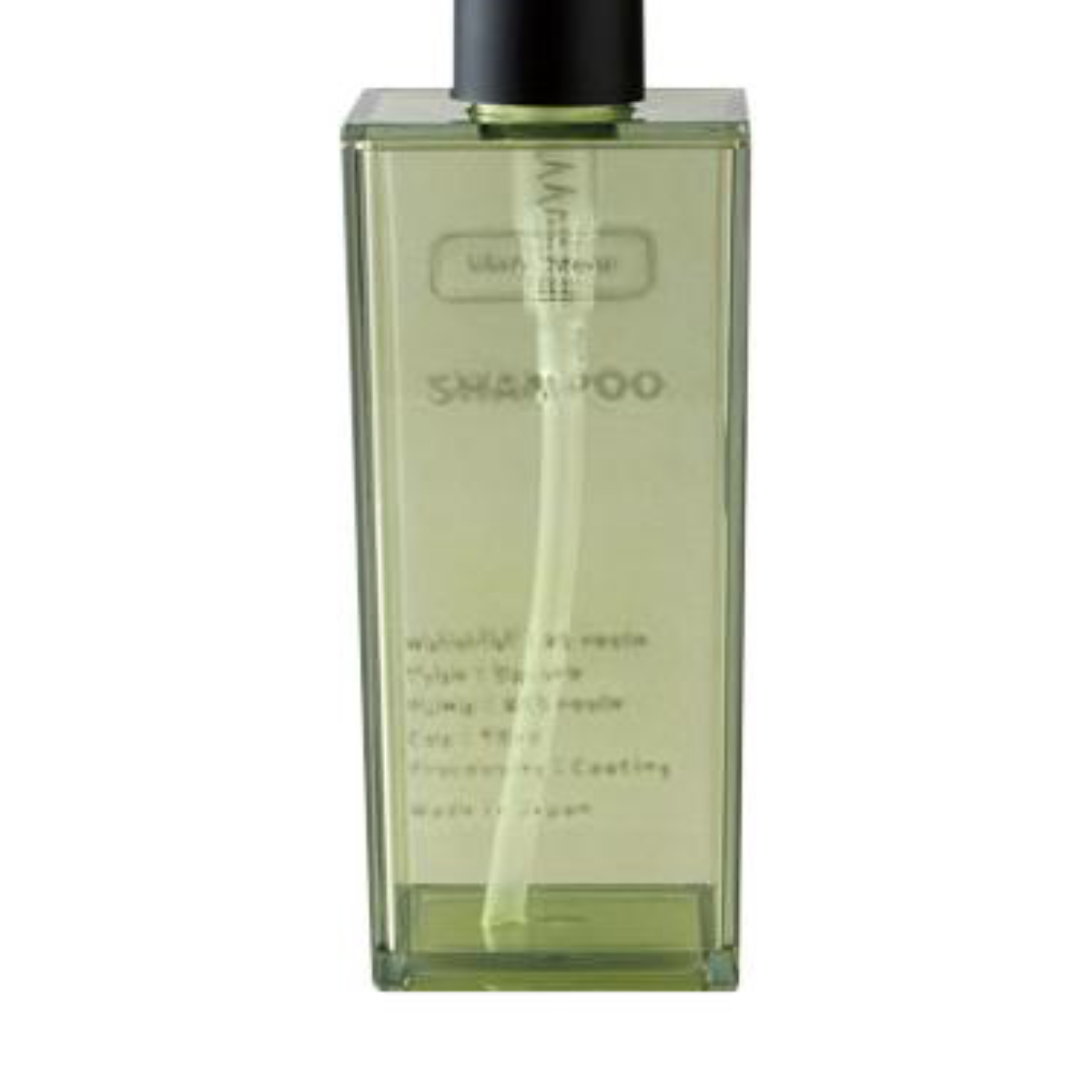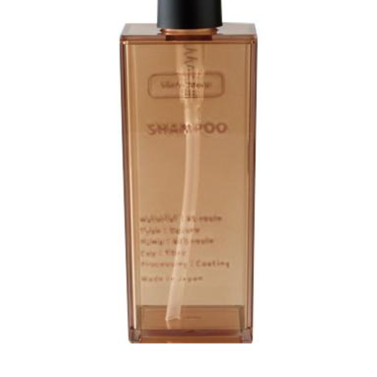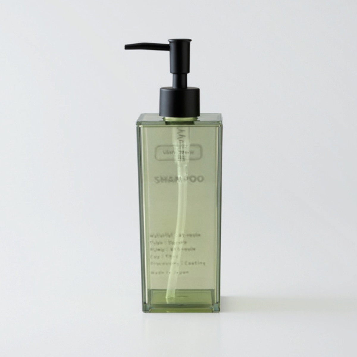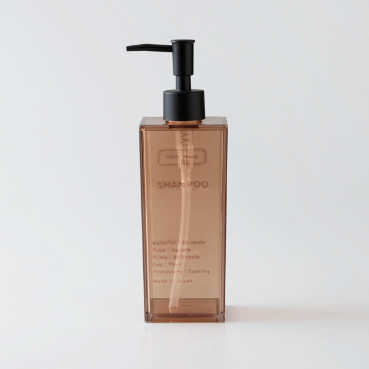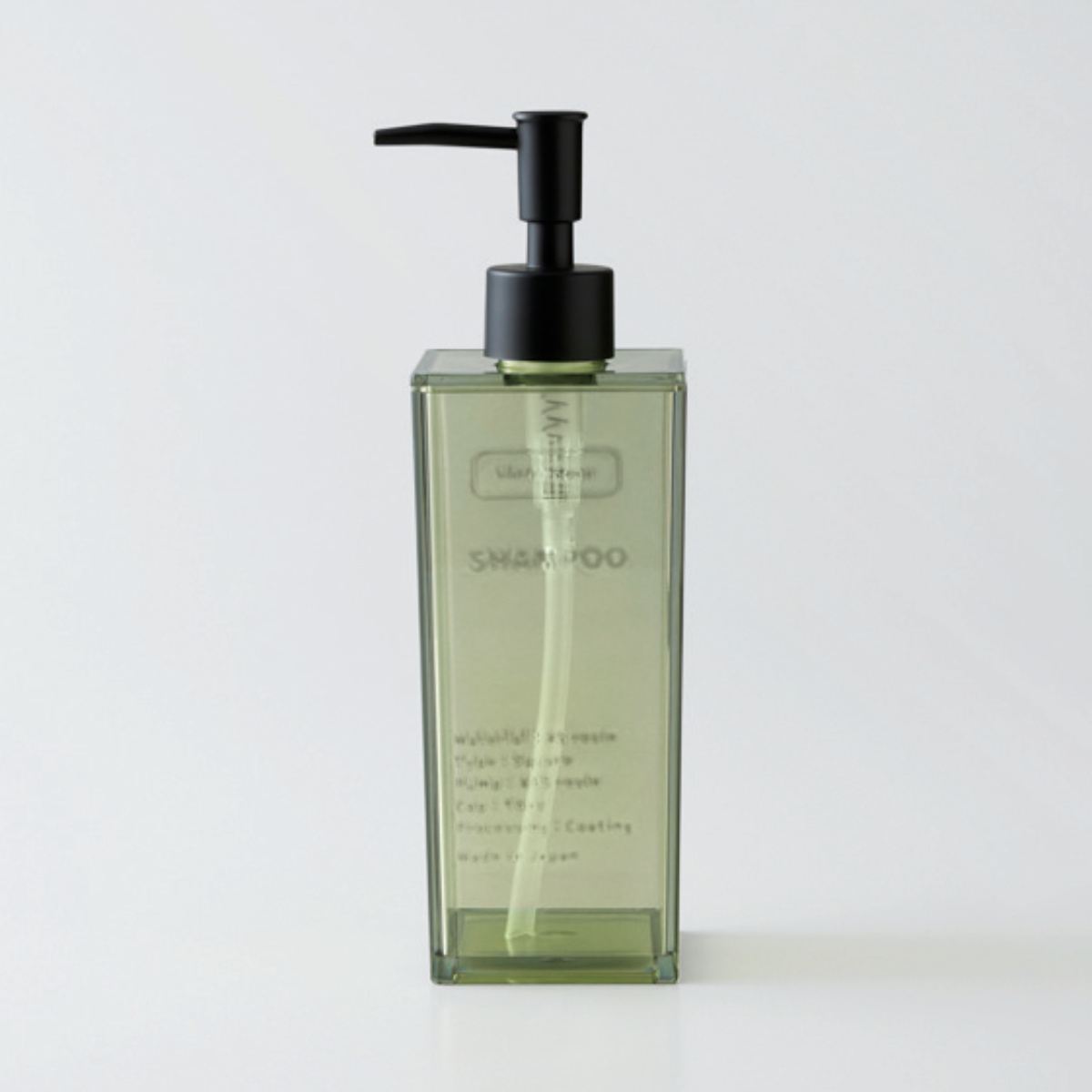 シャンプー用詰め替えボトルです。前面に施したエンボス加工のようなプリントにより、アンティークガラスのような風合いに仕上げました。クリア素材で中身が見えやすく、残量の確認も簡単です。バスルームにさりげない上質感をプラスし、生活感を抑えたすっきりとした空間を演出するディスペンサーです。