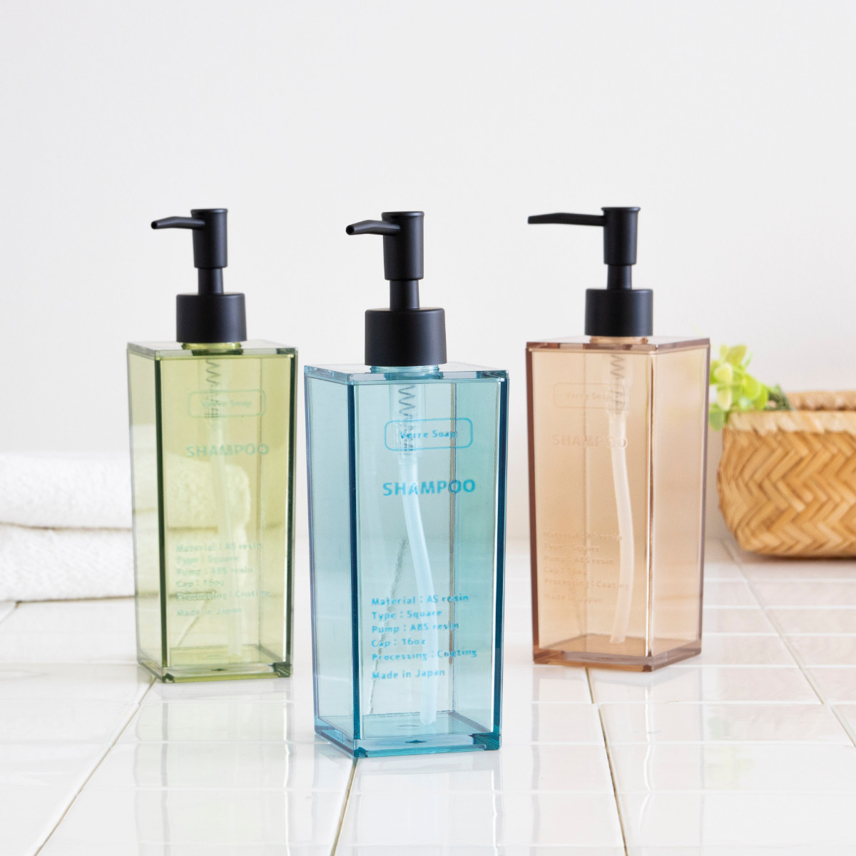 ブルー・グリーン・ブラウンの3色展開です。用途ごとに色を分けたり、洗面所やバスルームの雰囲気に合わせてお選びいただけます。