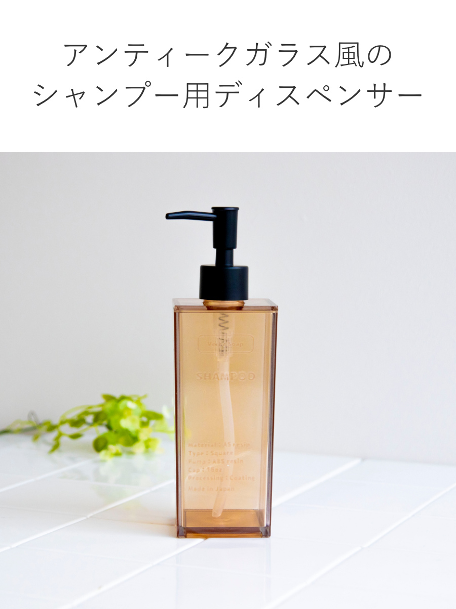ワンプッシュで適量が出せるシャンプー用ディスペンサーです。アンティークガラス風やクリアボトルのデザインで、洗面所やバスルームに置くだけでおしゃれに演出できます。操作性や利便性にもこだわっており、忙しい日常でもストレスなくお使いいただけます。