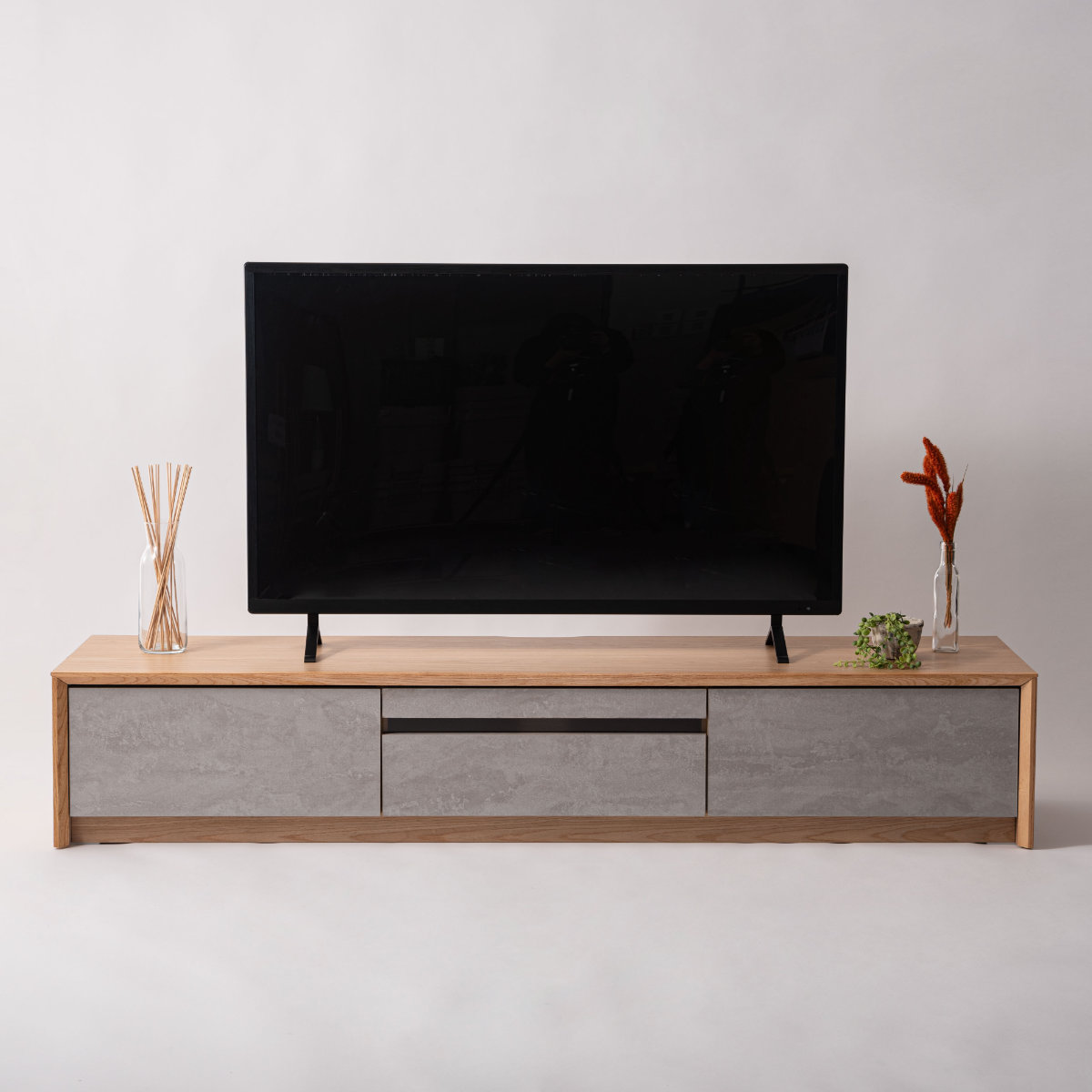 直線的なラインでシンプルなフォルムのローボードです。木目を活かした本体に、石目調デザインを施した前板がアクセント。奥行は41.5cmとスリムで、圧迫感を与えずお部屋を広く見せてくれます。