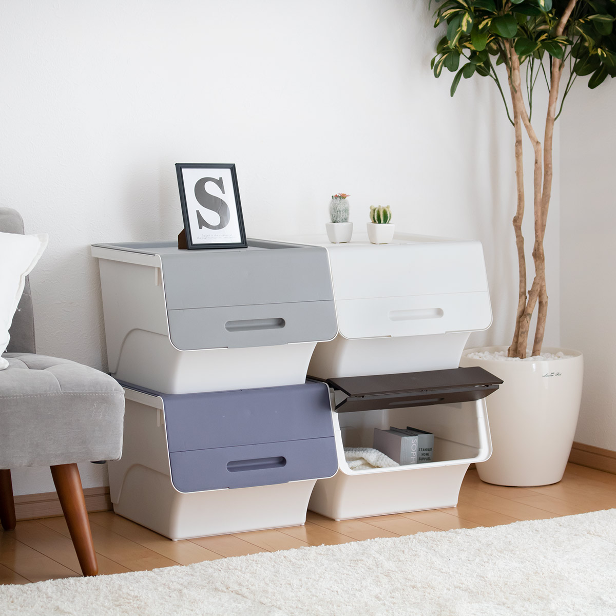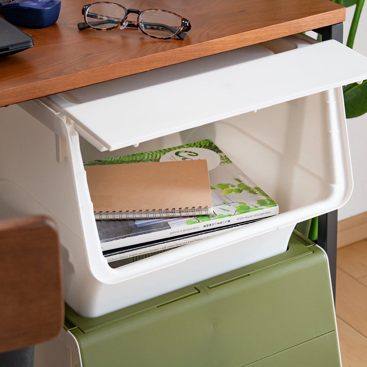フタ付き衣装ケースなどの収納ケースは、積み重ねて使うと下段から物を取り出すのが一苦労です。「froq -フロップ-」なら前開きフタなので、積み重ねて使っても下段から簡単に物を出し入れすることできます。
