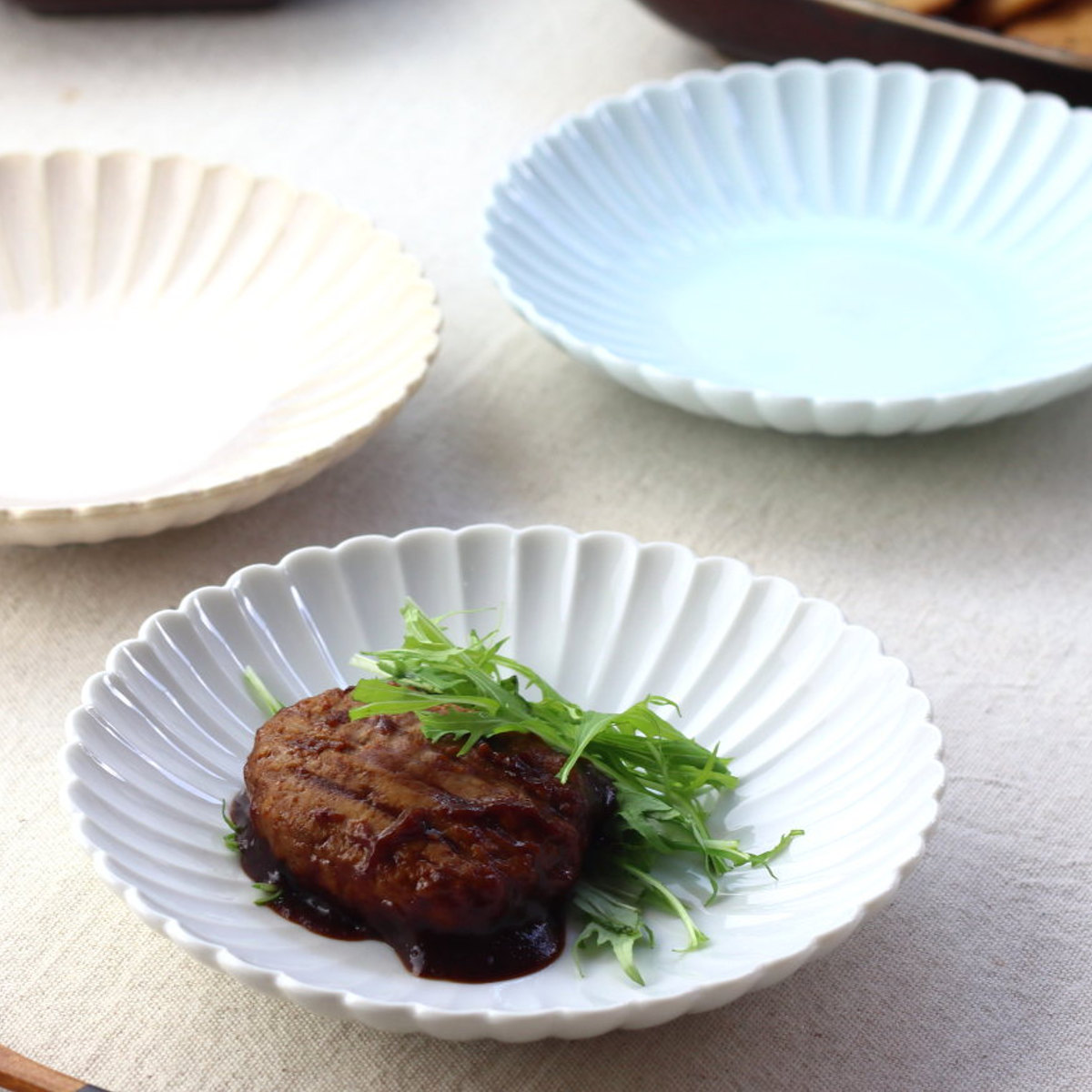 花びら一枚一枚を連想させる細かなレリーフが美しく、その穏やかな表情で様々な料理を華麗に演出します。スタッキングしてもかさ張らないのも嬉しいポイントです。