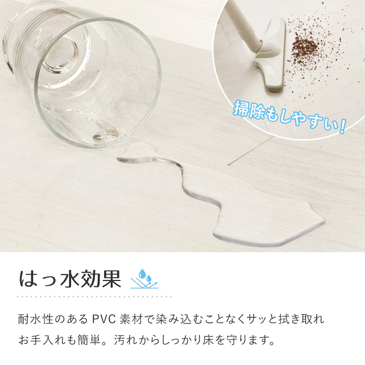 耐水性のある素材を使用しているので、染み込むことなくサッと拭き取れてお手入れも簡単です。汚れからしっかり床を守ってくれるので毎日のお掃除もラクにできます。