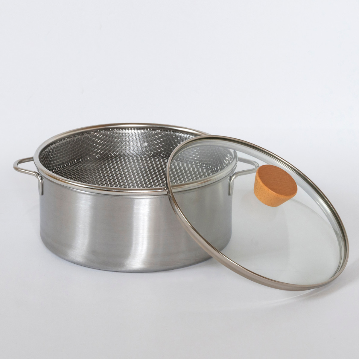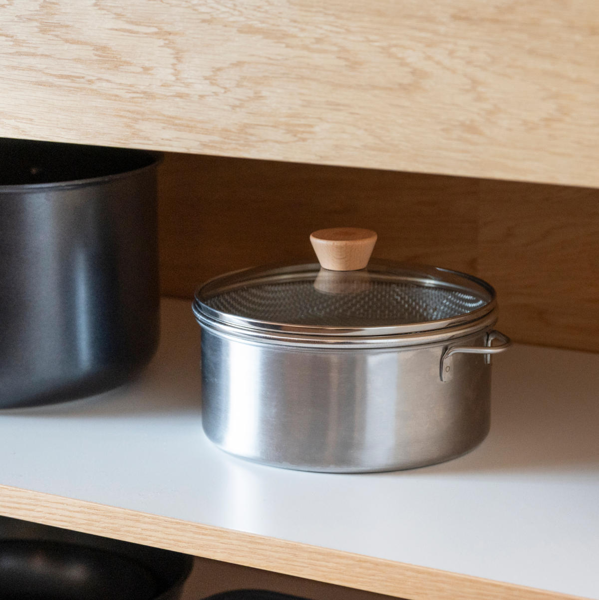 | 材質 | 本体・ざる:ステンレス鋼 ガラス蓋:強化ガラス、木(ウレタン塗装) |