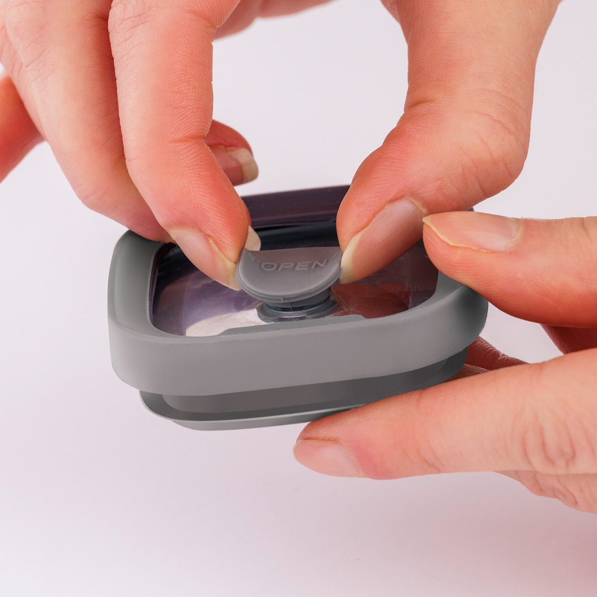 フタをのせる前に、バルブを上に引き上げてください。本体にフタをセットし、バルブを押し下げると密閉状態になります。フタを外す時は、バルブを上に引き上げて密閉状態を解除します。