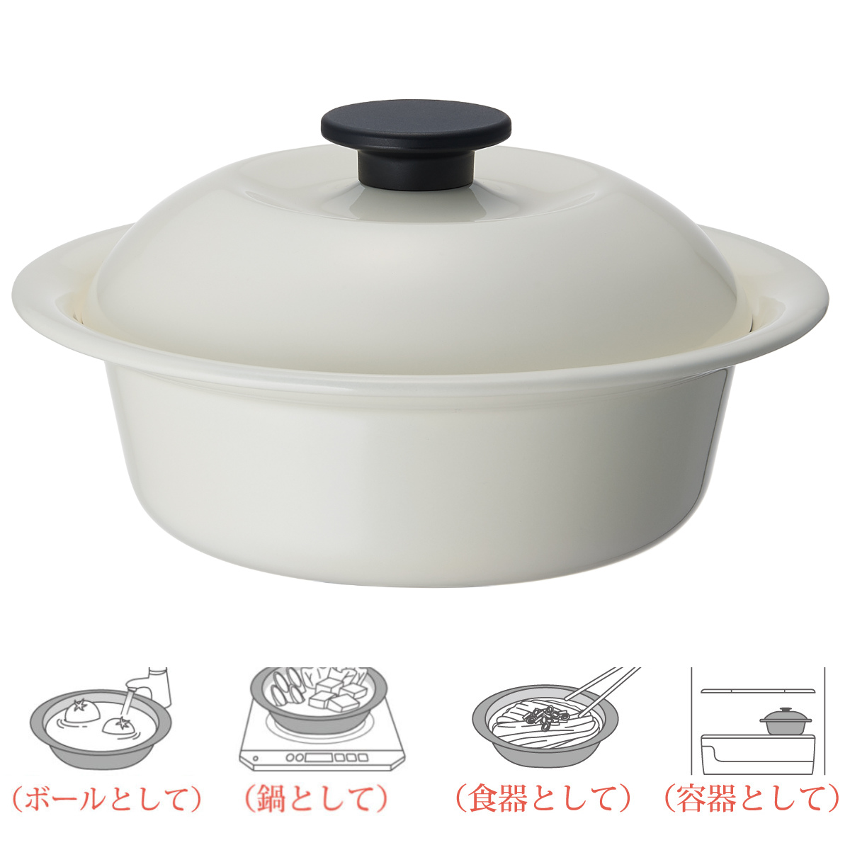 ホーローは優れた保温力で温度を逃がしにくく、素材の甘味と旨味を際立たせます。汚れや雑菌が繁殖しにくいので保存にも向いており、下ごしらえから調理、食器、保存容器とこれひとつで4役こなします。
