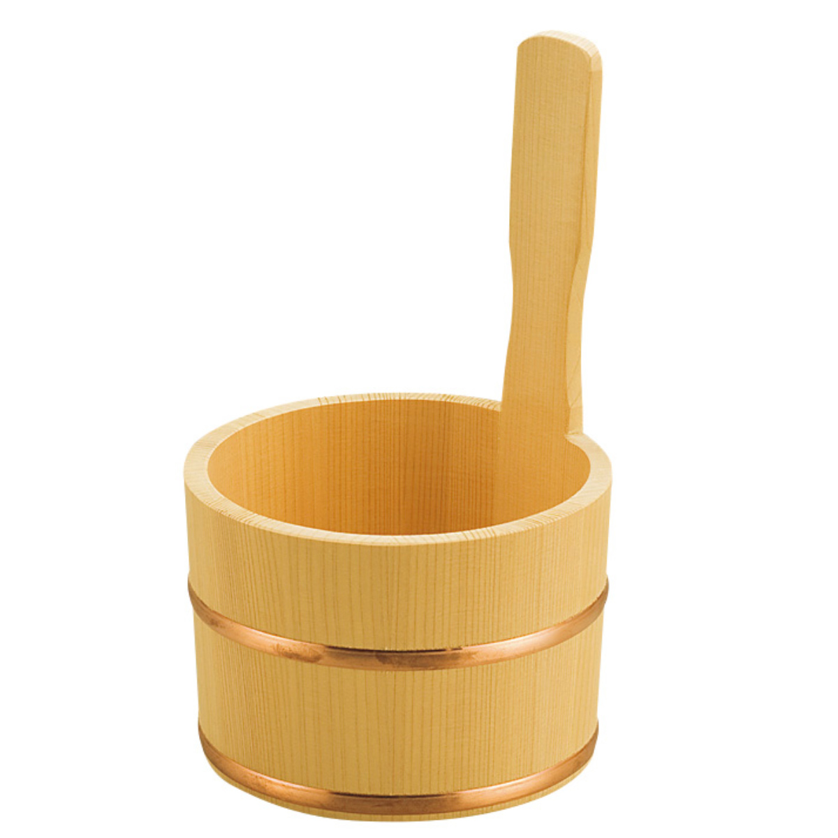 天然木の風合いが魅力的な、椹(さわら)製の片手湯桶です。タガに「銅」を使用しており、装飾性が高く、工芸的な印象です。