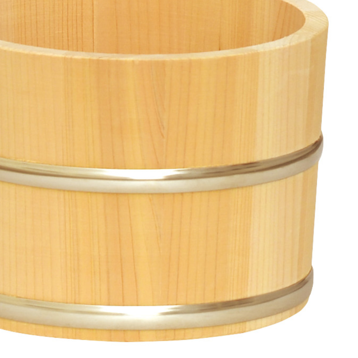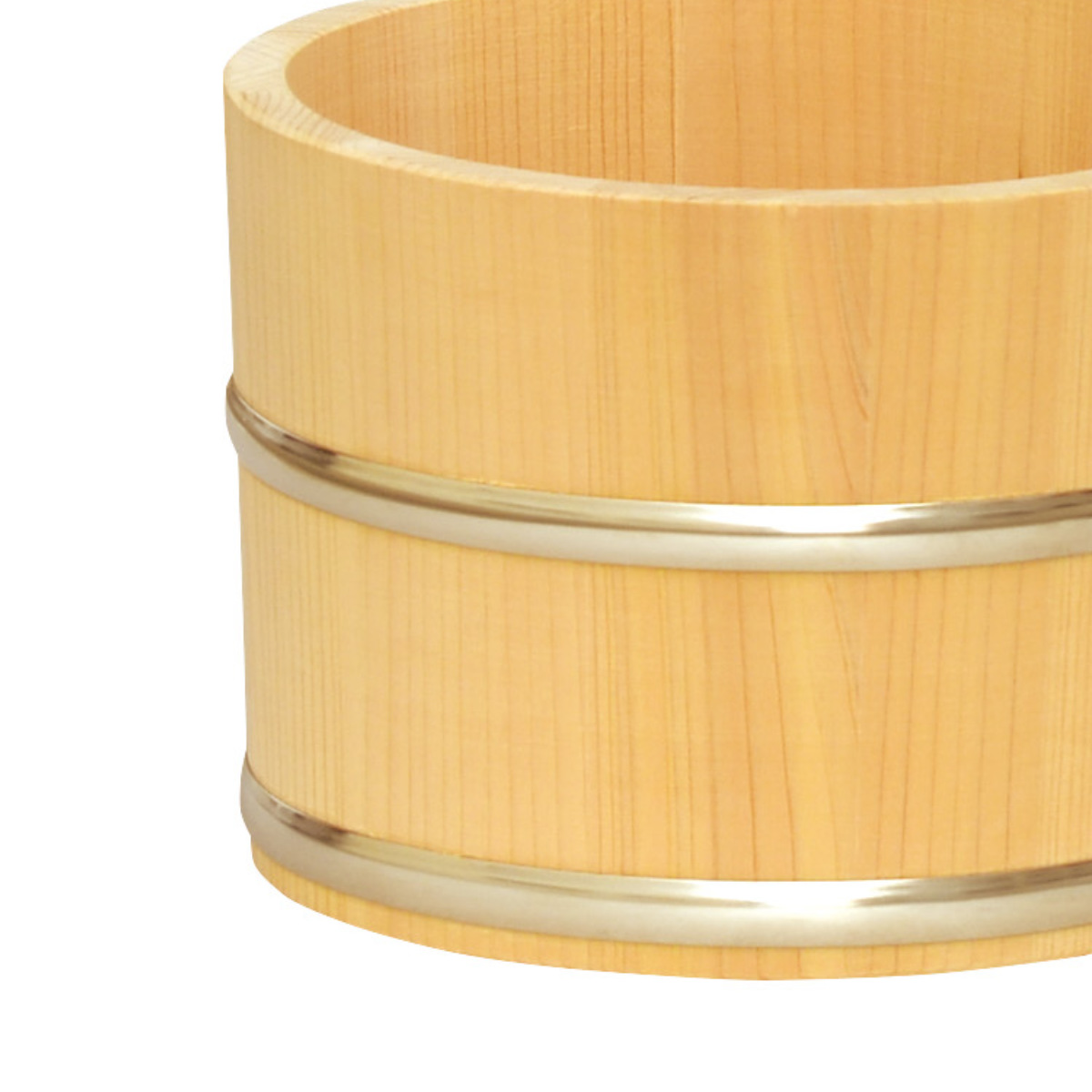 天然木の風合いが魅力的な、椹(さわら)製の片手湯桶です。タガに「ステンレス」を使用しており、高い耐食性で水場でも錆びにくく、日常使いに最適です。