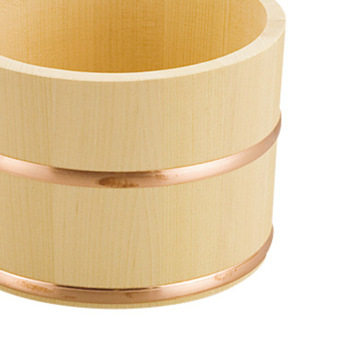 天然木の風合いが魅力的な、ヒバ製の片手湯桶です。タガに「銅」を使用しており、装飾性が高く、工芸的な印象です。