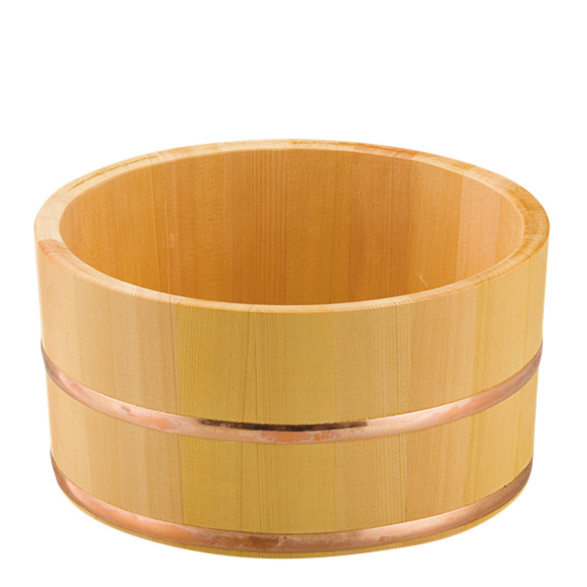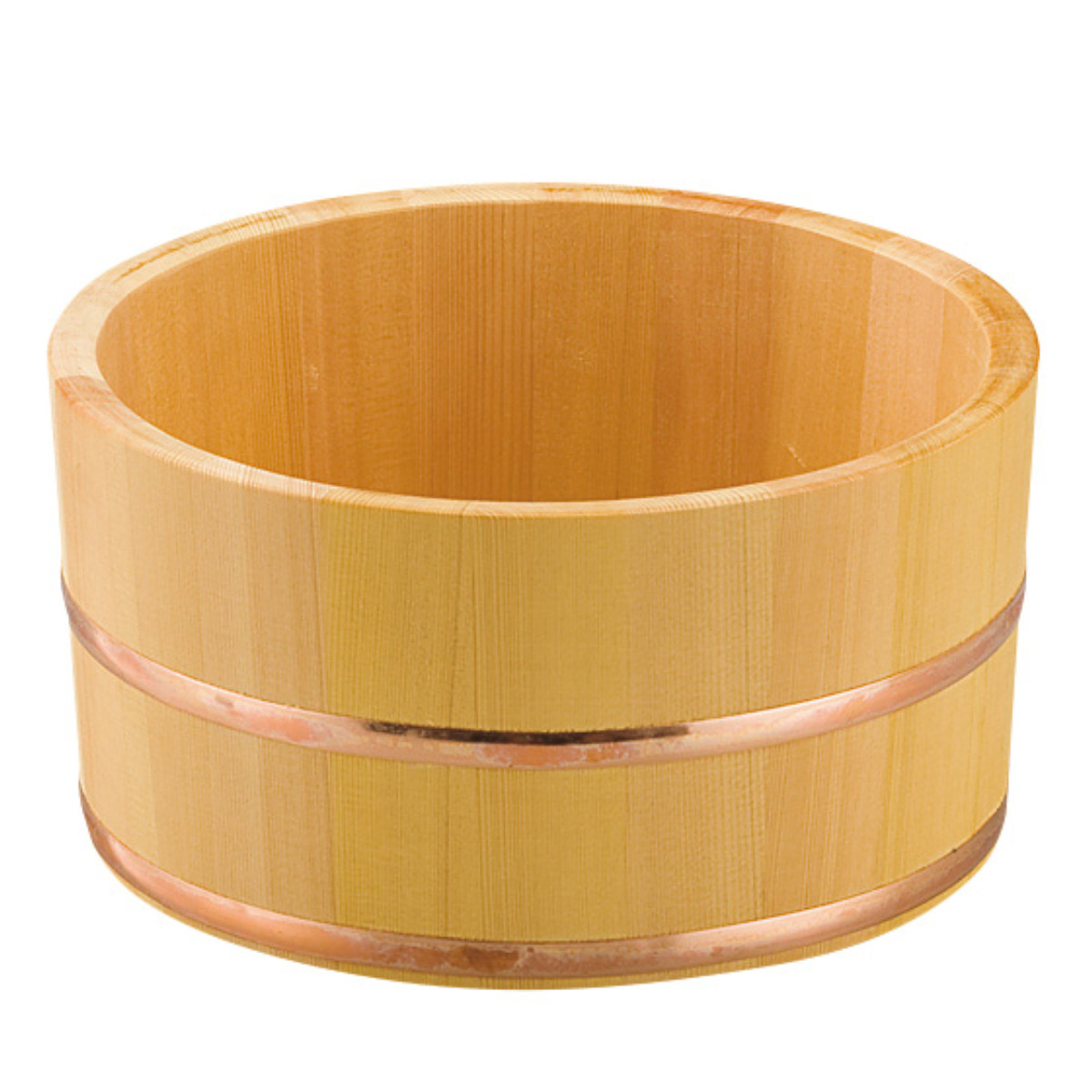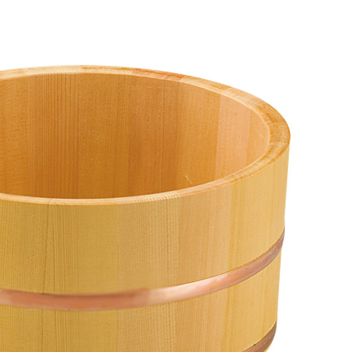 天然木の風合いが魅力的な、椹(さわら)製の湯桶です。タガに「銅」を使用しており、装飾性が高く、工芸的な印象です。