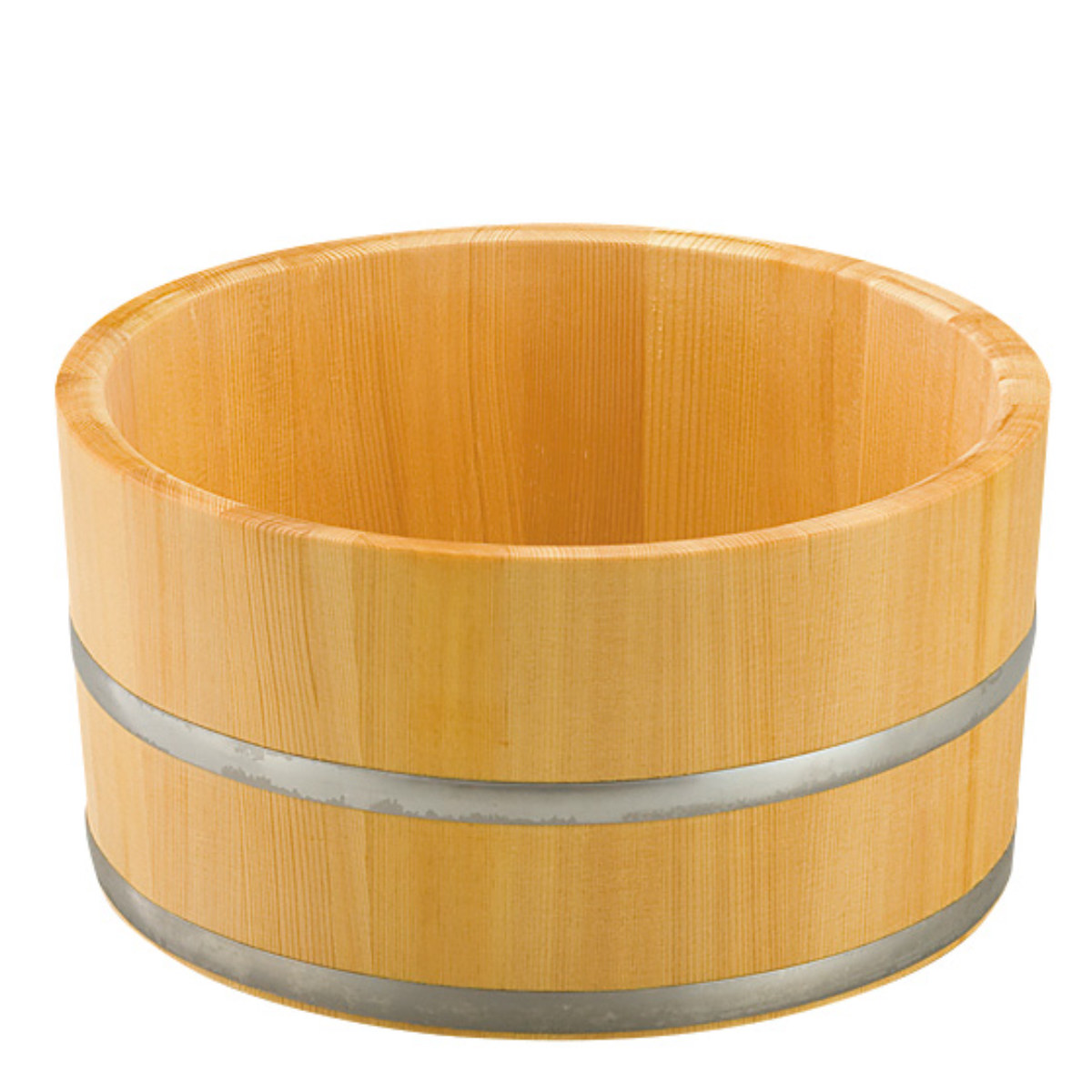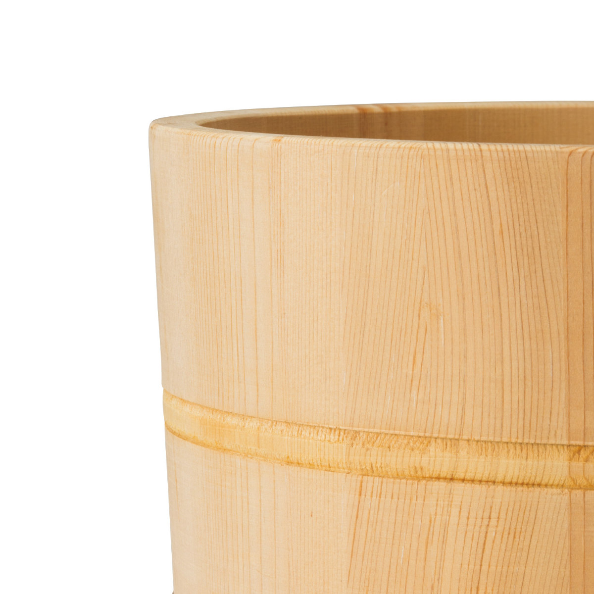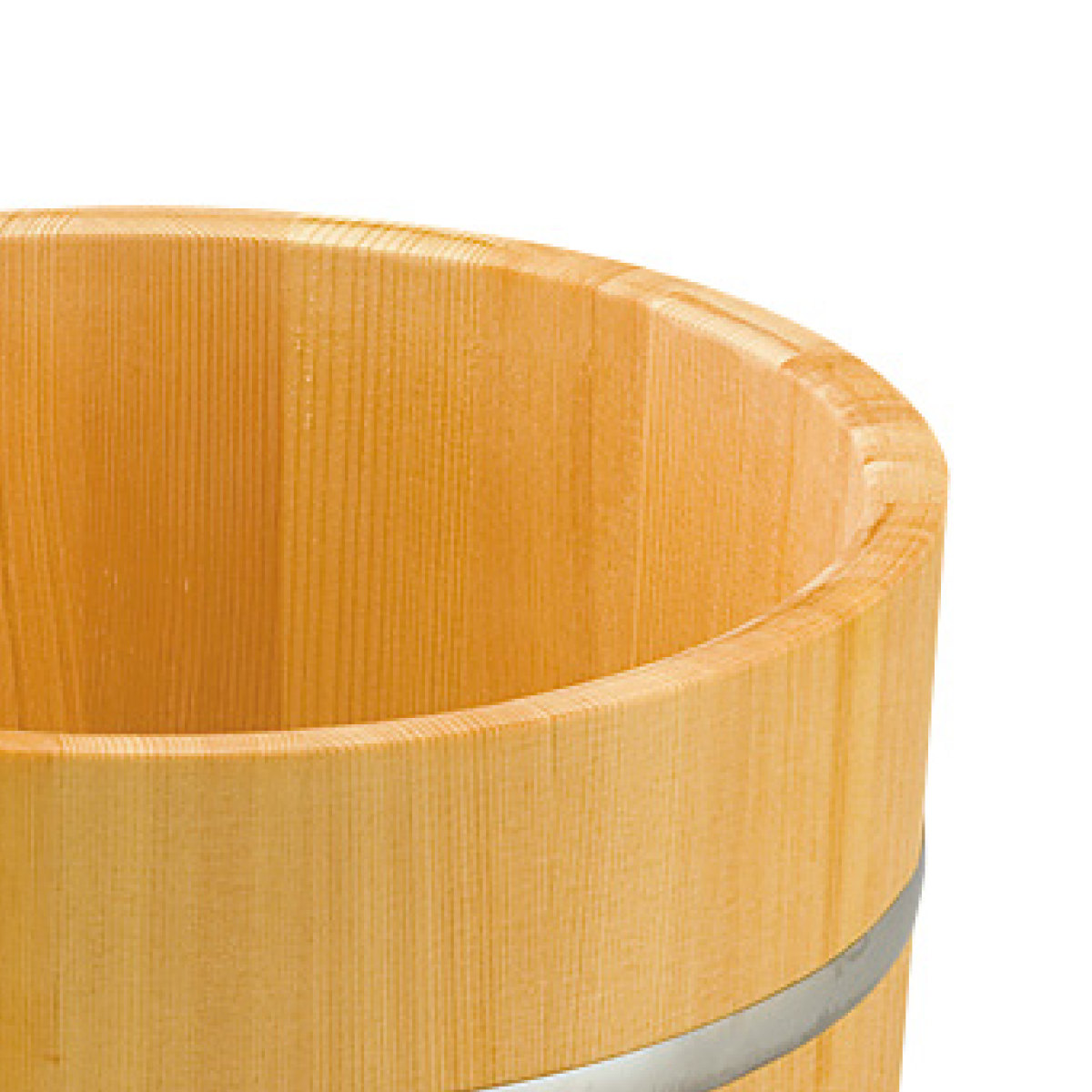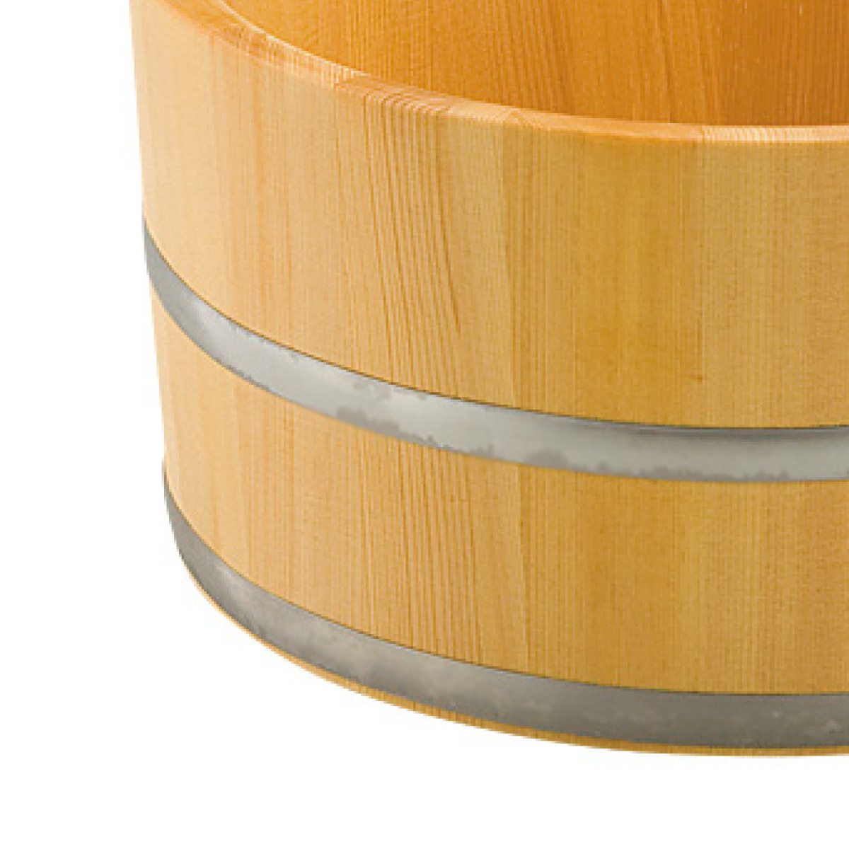 天然木の風合いが魅力的な、椹(さわら)製の湯桶です。タガに「ステンレス」を使用しており、高い耐食性で水場でも錆びにくく、日常使いに最適です。