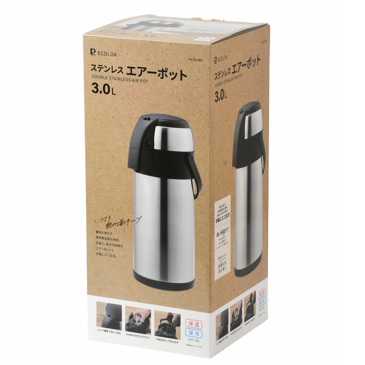 ポット エコロア ステンレスエアーポット3.0L ( 魔法瓶 保温 保冷 エアーポット 卓上ポット コードレス 持ち運び 大容量 プッシュ式 広口 屋外 アウトドア )