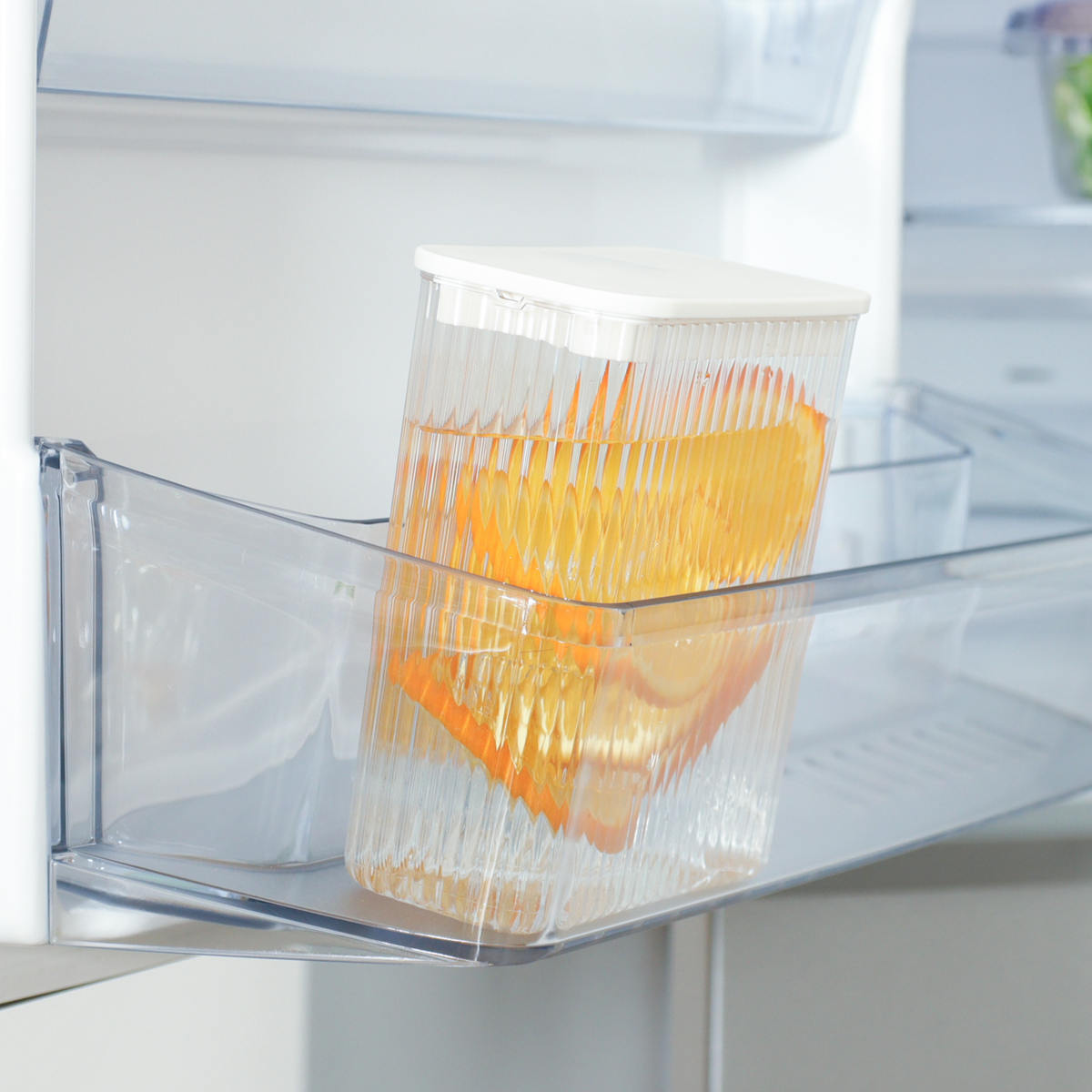 冷蔵庫の棚にスッポリ収まるスリム設計の冷水ポットです。ドアポケットを使わずに収納できるため、これまで無駄になりがちだった棚のすき間を有効活用できます。