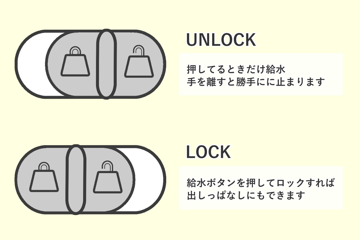 注ぎ口にはロック機能が付いています。給水ボタン押してからロックすれば手を放しても出しっぱなしにすることができます。ロックを解除している時は、押している時だけ飲み物が出て離すと勝手に止まり、片手で操作できます。出しすぎてしまう心配がないので、小さなお子様でも自分で注ぐことができます。