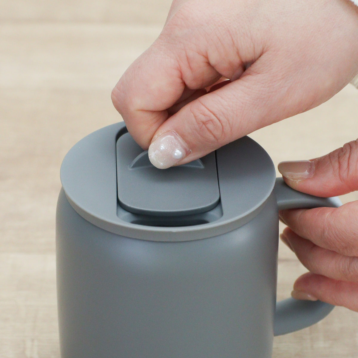 保温・保冷効果を高めるだけでなく、ほこりの侵入を防ぎ、人の出入りが多いオフィスやアウトドアでも安心して使えるスライド式のフタ付きです。