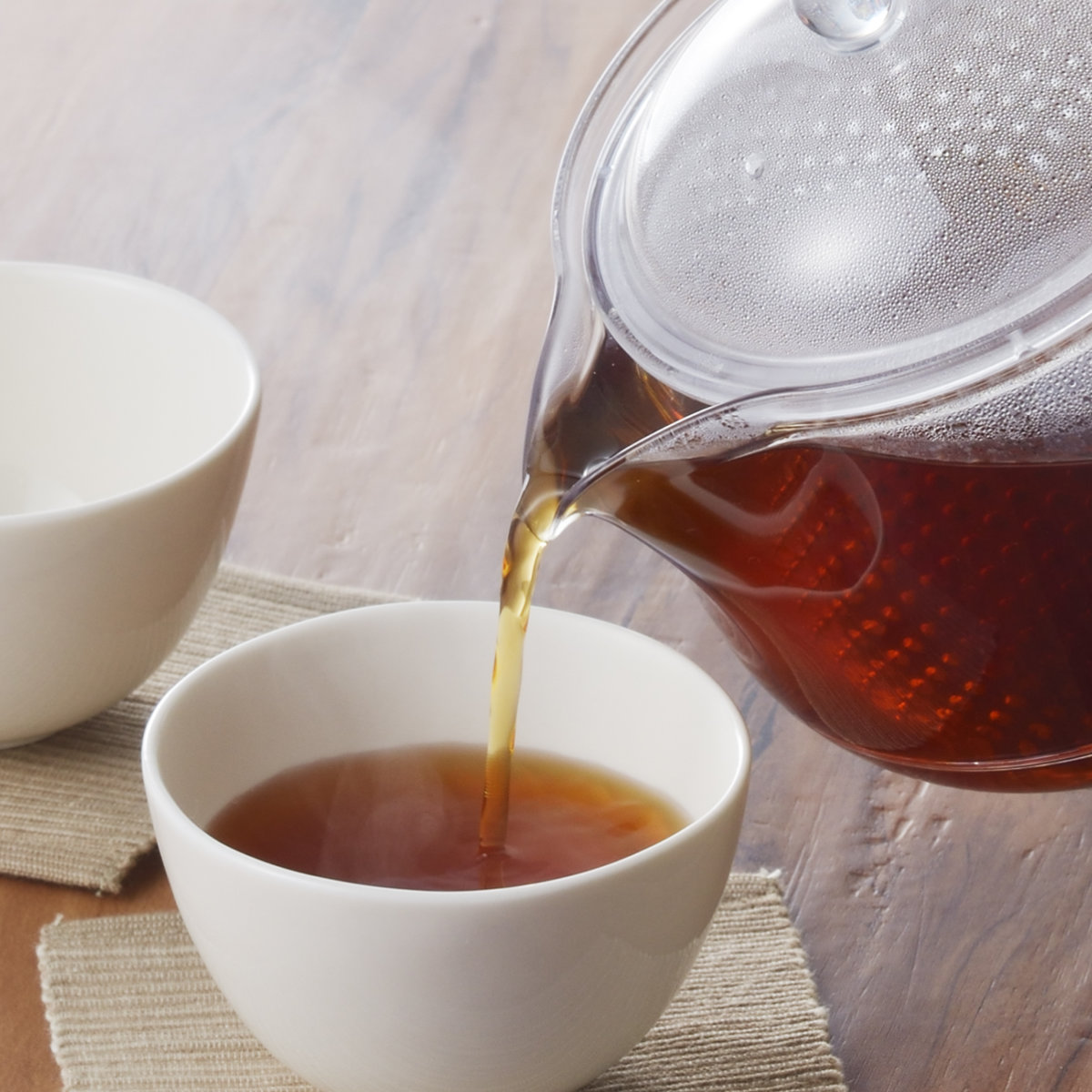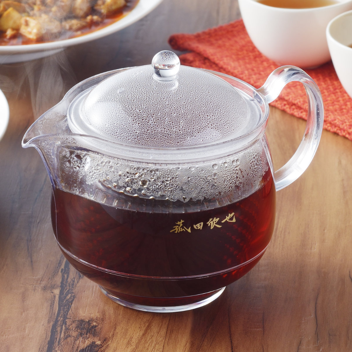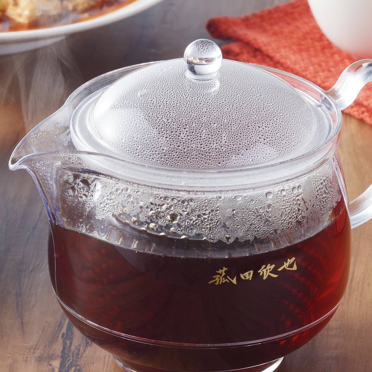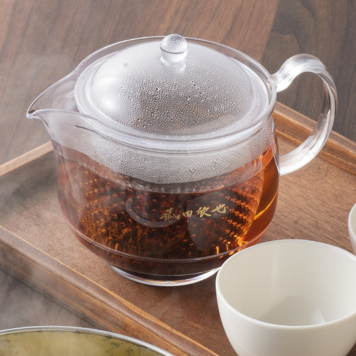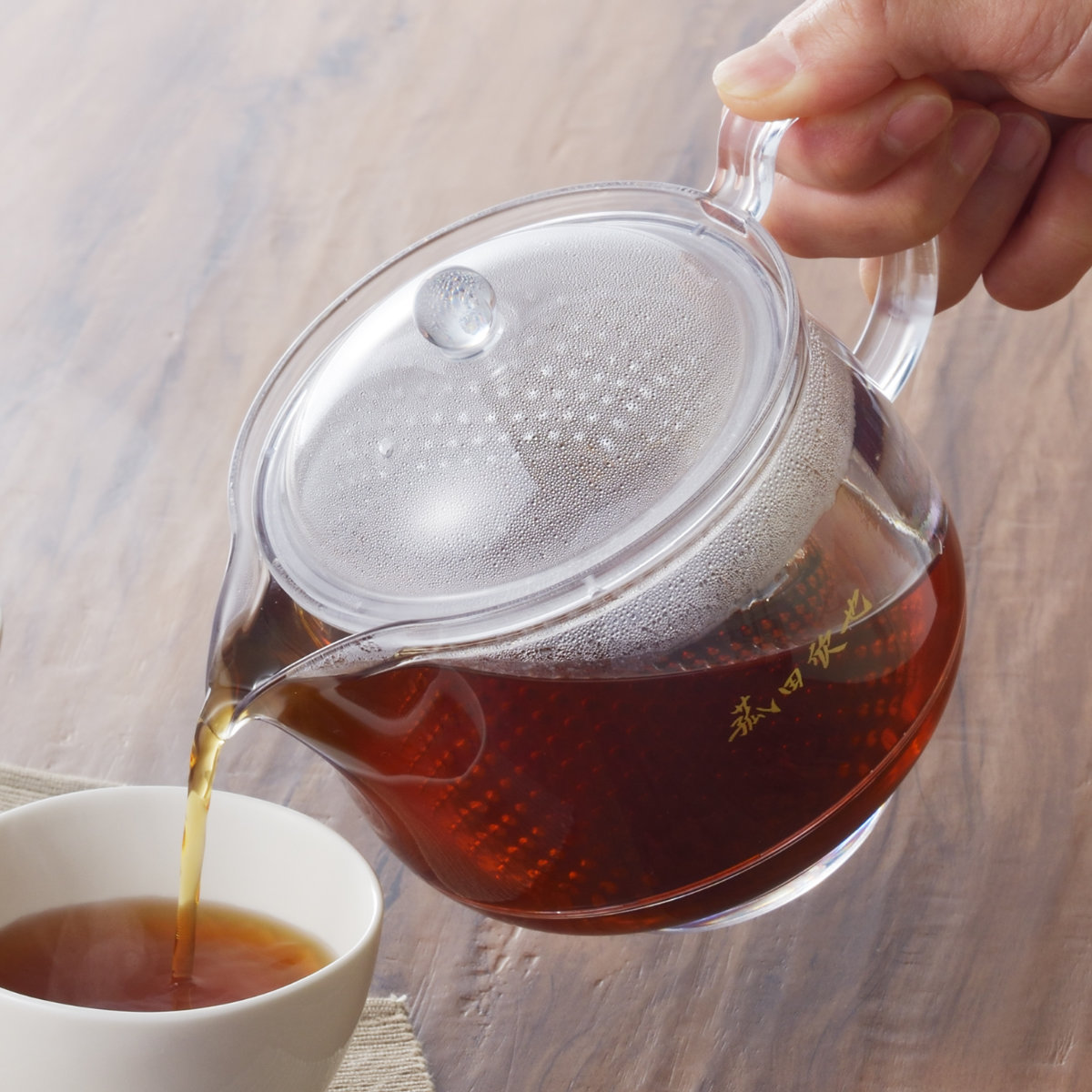ガラスのような透明感を持ちながら、割れにくい高耐久樹脂を使用したクリアティーポットです。お茶の色合いが美しく映え、淹れた瞬間に金色のロゴが浮かび上がる上質なデザインが、毎日のティータイムを華やかに演出します。容量は730mlで普段使いはもちろん、来客時のおもてなしにもぴったりです。