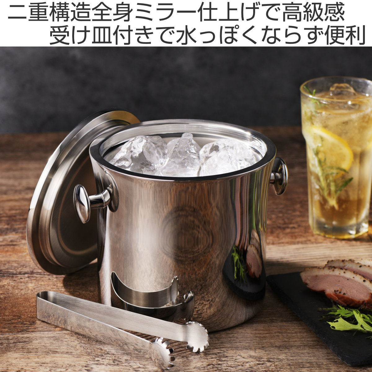 二重構造により保冷力が高く、氷が溶けにくく水っぽくなりにくいのが特長です。付属の受け皿が余分な水分をしっかりキャッチし、氷と水が分離するため、最後までクリアな氷を使うことができます。