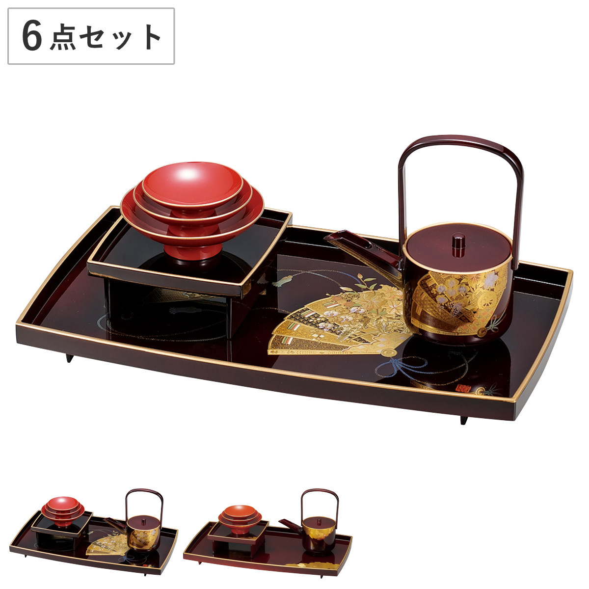 | サイズ | 屠蘇台:約 幅39.5×奥行22.5×高さ3.2(cm) 銚子:約 幅15.5×奥行8.5×高さ16.5(cm) 盃台:約 幅13×奥行13×高さ5.2(cm) 盃(大):約 高さ3.7(cm)直径:約 11(cm) 盃(中):約 高さ3(cm)直径:約 9(cm) 盃(小):約 高さ2.4(cm)直径:約 7.5(cm) |