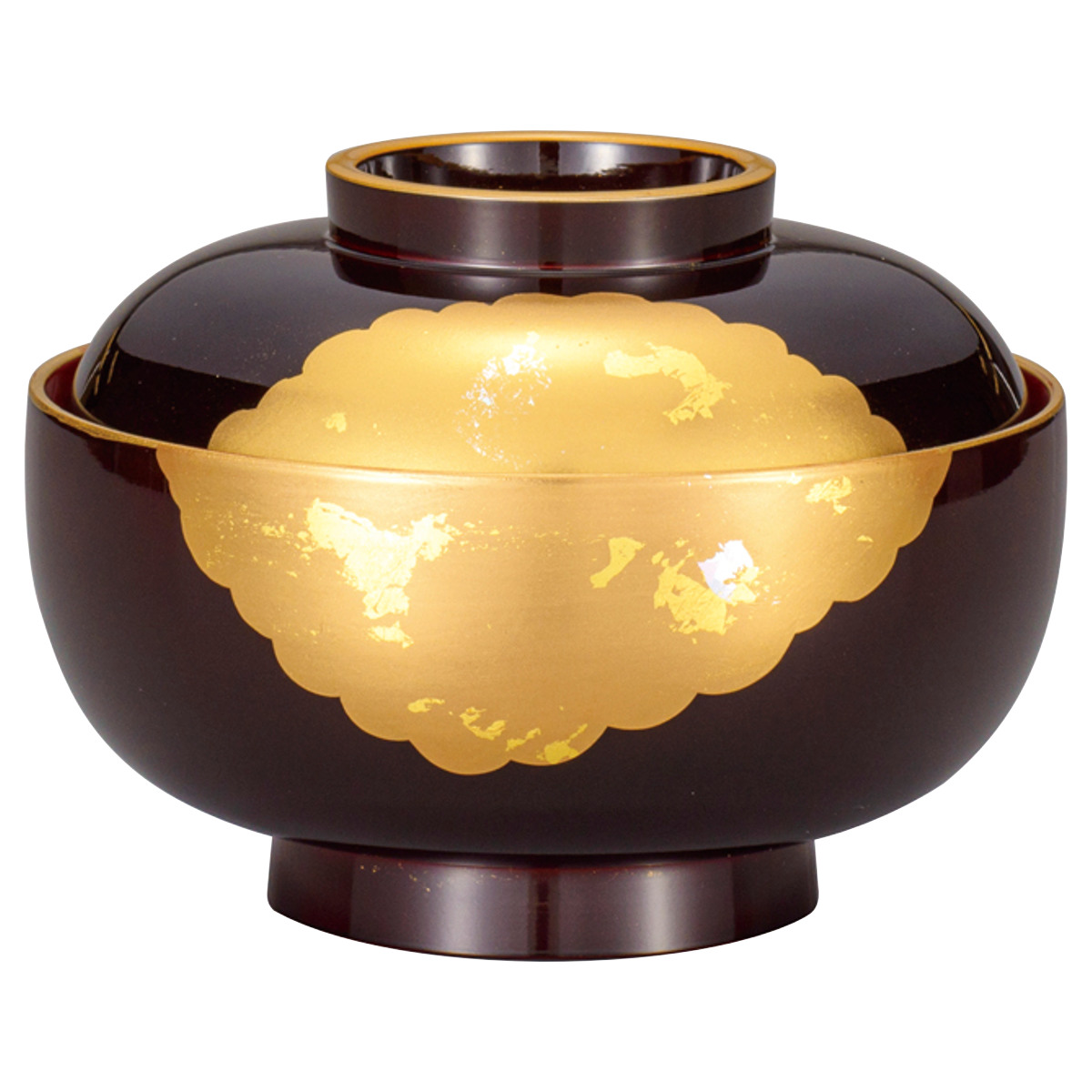 深みのある黒塗りに、縁起の良い吉祥文様をあしらい、晴れの日の食卓を華やかに彩ります。内側は朱塗り仕上げで、汁物やお雑煮の色合いがきれいに映えます。お正月やお祝いの席はもちろん、来客用やちょっと特別な日の食卓にもおすすめです。