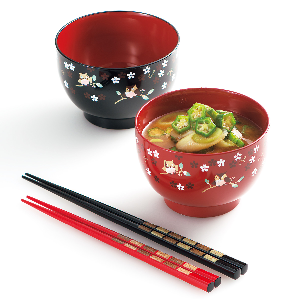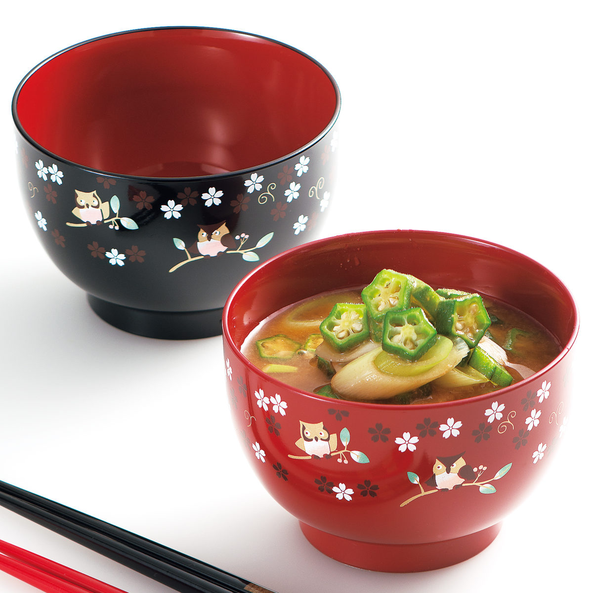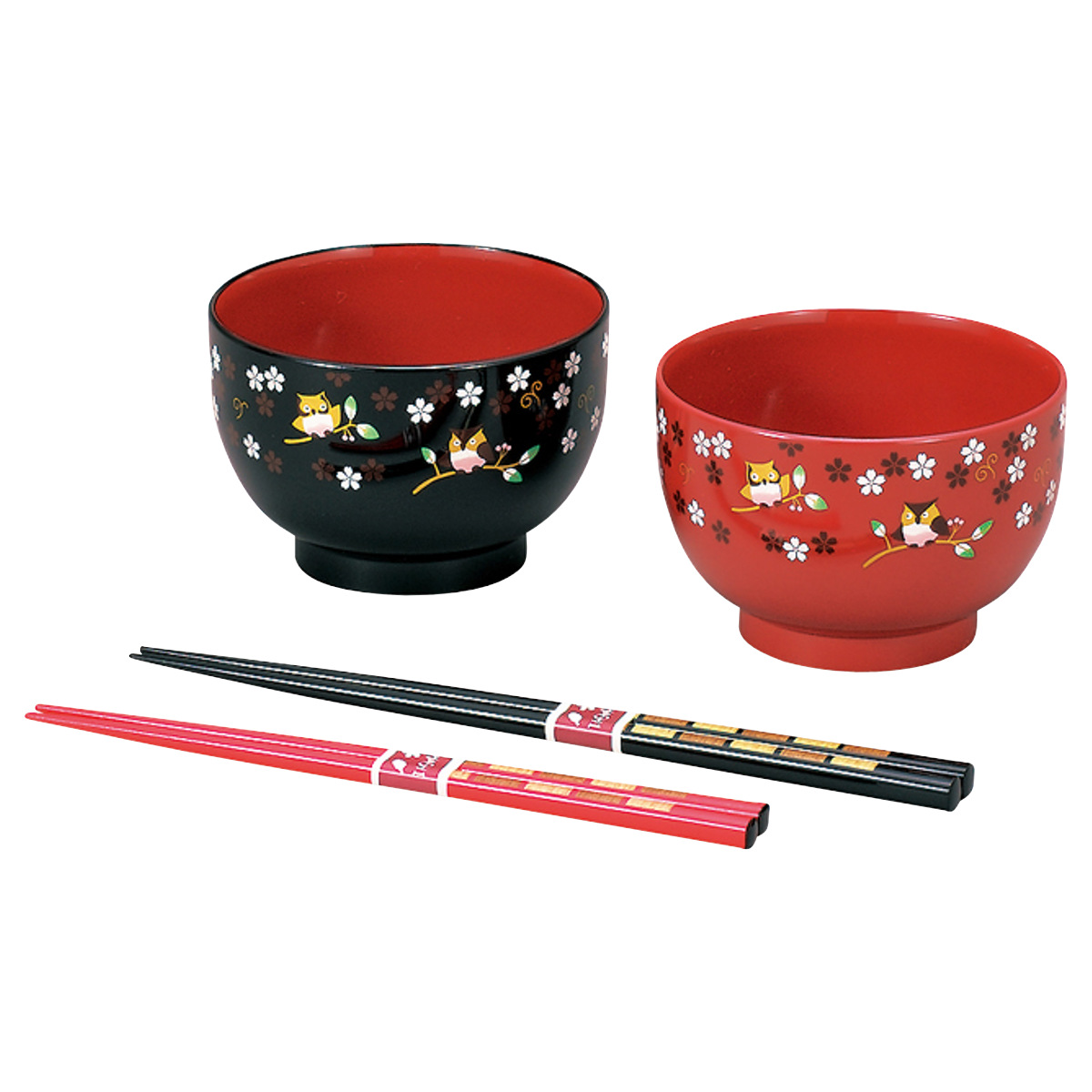 ふくろうと桜の絵柄が可愛らしい、汁椀とお箸のペアセットです。赤と黒の色違いで、並べると食卓が華やぎます。軽くて割れにくい樹脂製の汁椀は、毎日の味噌汁やスープに使いやすい形です。お箸も椀に合わせたペア仕様で、統一感のあるセットです。