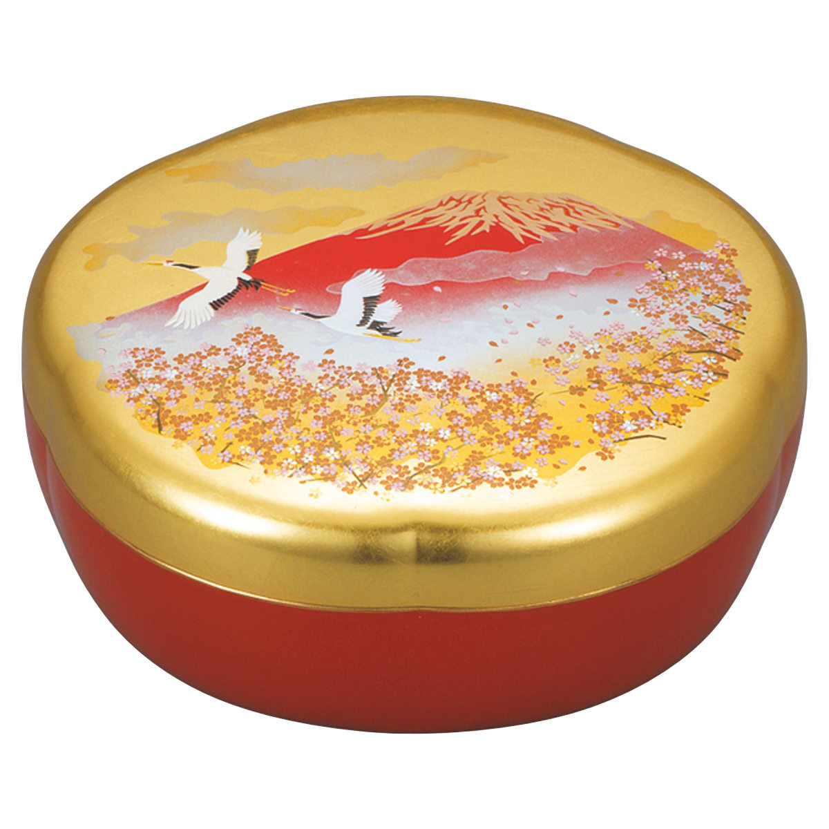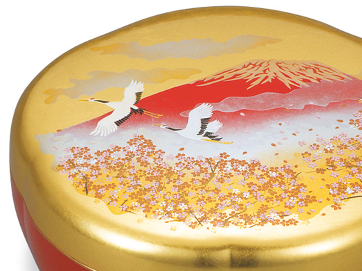 日本を象徴する吉祥文様を組み合わせたデザインは、長寿や繁栄、慶びを意味し、お祝いの席にふさわしい一品です。側面の朱塗りが全体を引き締め、上品さの中にあたたかみも感じられます。お正月や特別な日、贈り物にもおすすめです。