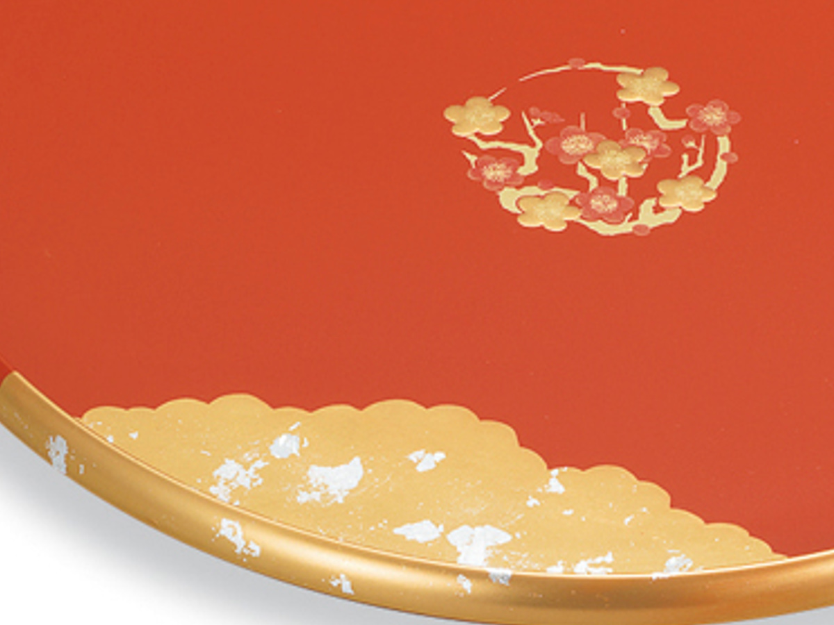 冬から春への移り変わりに、いち早く花を咲かせる梅は、春を知らせる喜びの象徴とされています。中央に金色の梅をあしらい、金雲でふちどった大変縁起の良い柄です。お正月や来客時など、にぎやかな食卓のおもてなしにぴったりです。