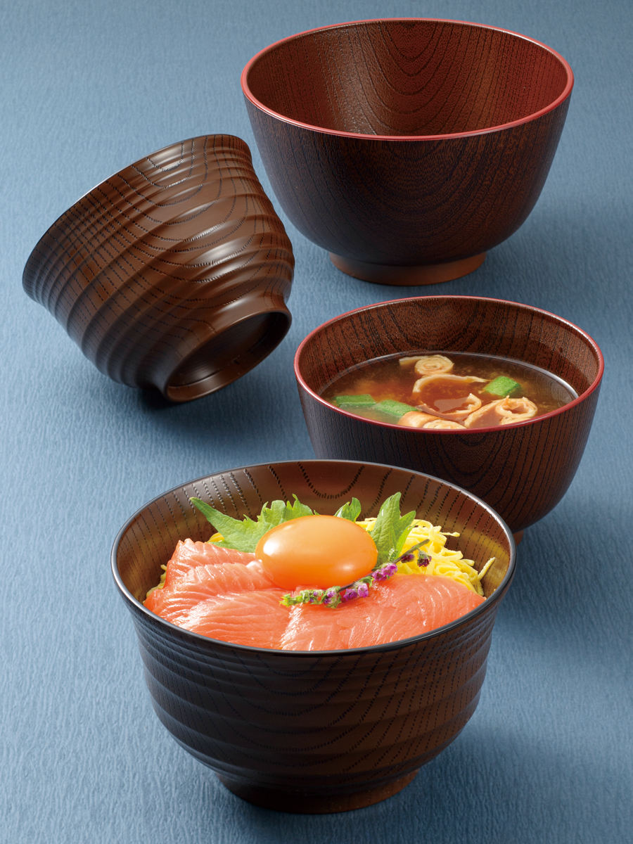 木目調の表情を活かした、ナチュラルな風合いのうるし塗食器です。毎日の食卓をやさしく、上品に彩ります。