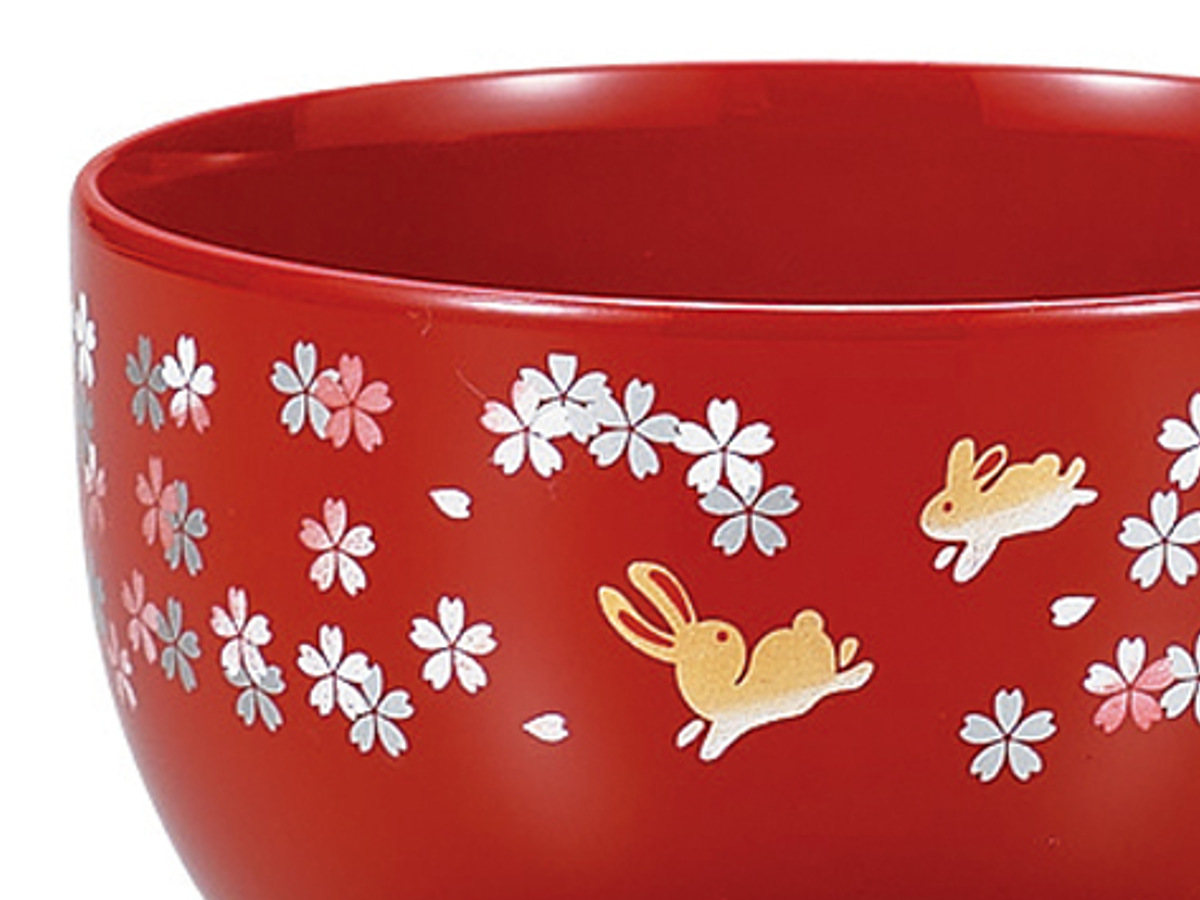 桜の中をぴょんと跳ねるうさぎが可愛らしく、食卓にやさしい華やかさを添えてくれます。つやのある質感で、毎日の食卓にはもちろん、お正月やお祝いの席にもぴったりです。