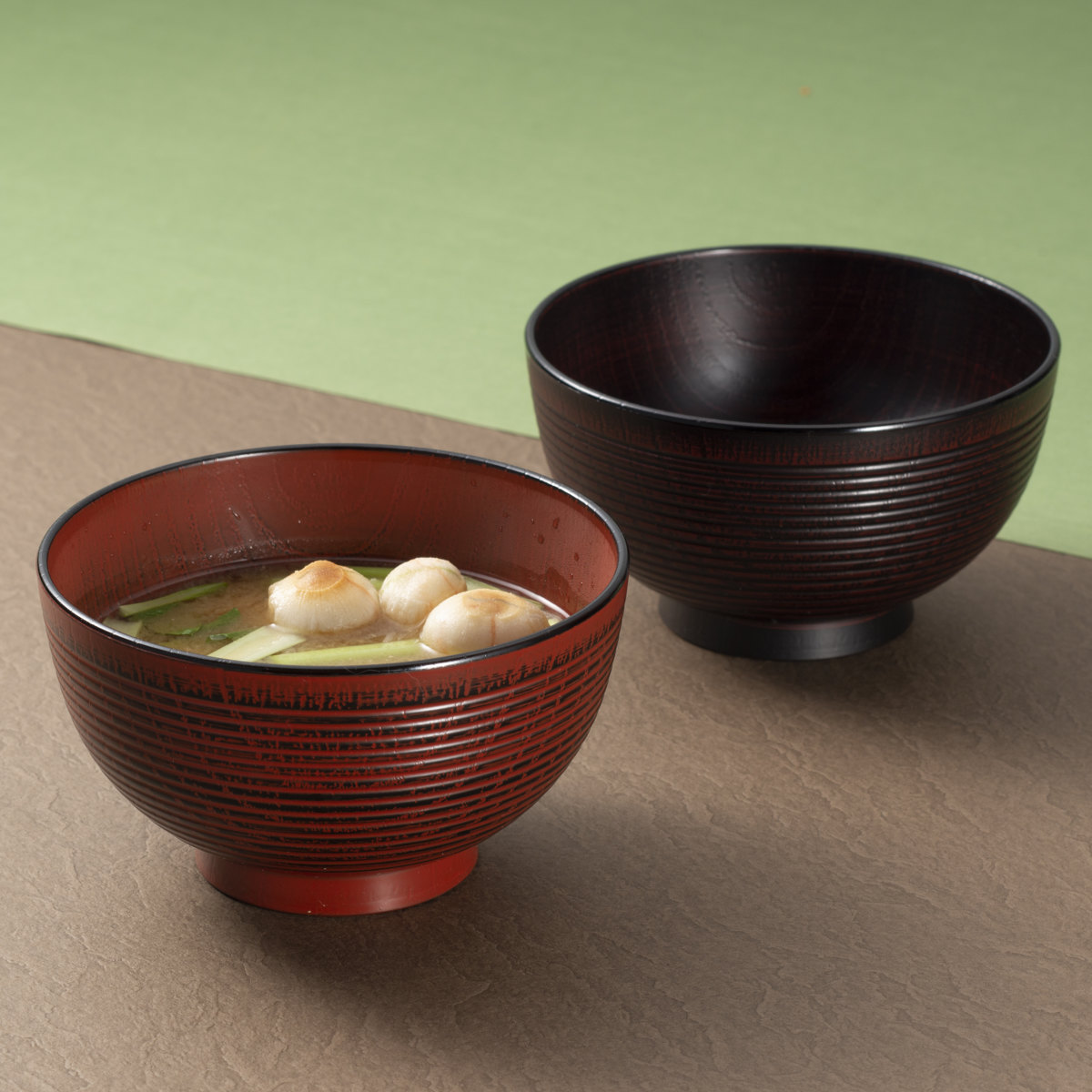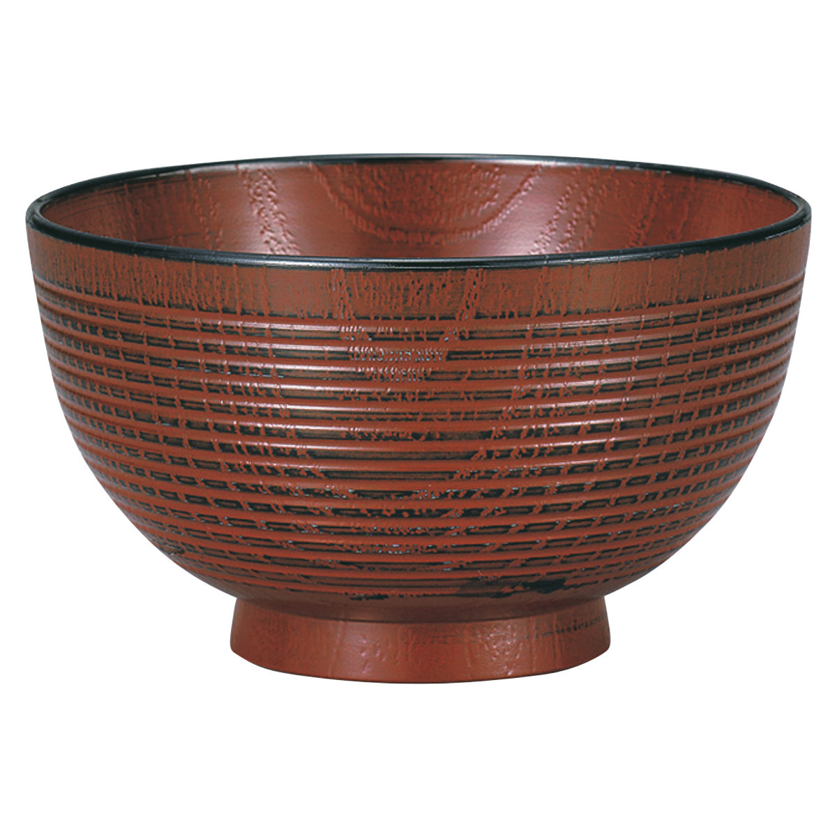樹脂製で軽くて割れにくい汁椀です。欅を思わせる木目に千筋模様を施した、手に馴染むデザインです。味噌汁やお吸い物など普段使いに最適です。