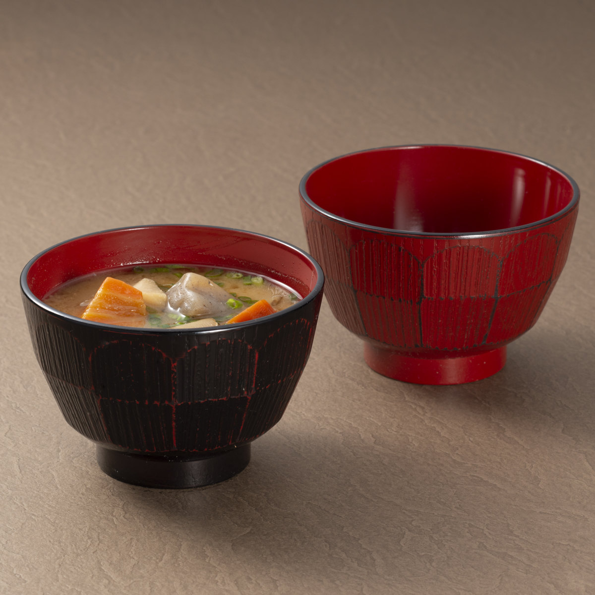 樹脂製で軽くて割れにくい汁椀です。表面には削ったような凹凸があり手に馴染みます。味噌汁やお吸い物など普段使いに最適です。