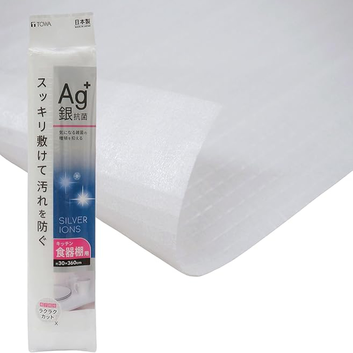 キッチンの食器棚や引き出しの中に敷くのに便利なキッチンシートです。上面フィルムには銀系無機抗菌剤、下面に防カビ剤を加工してあり、シートの表面に付着した雑菌の増殖を抑制してくれるので、衛生的にお使いいただけます。