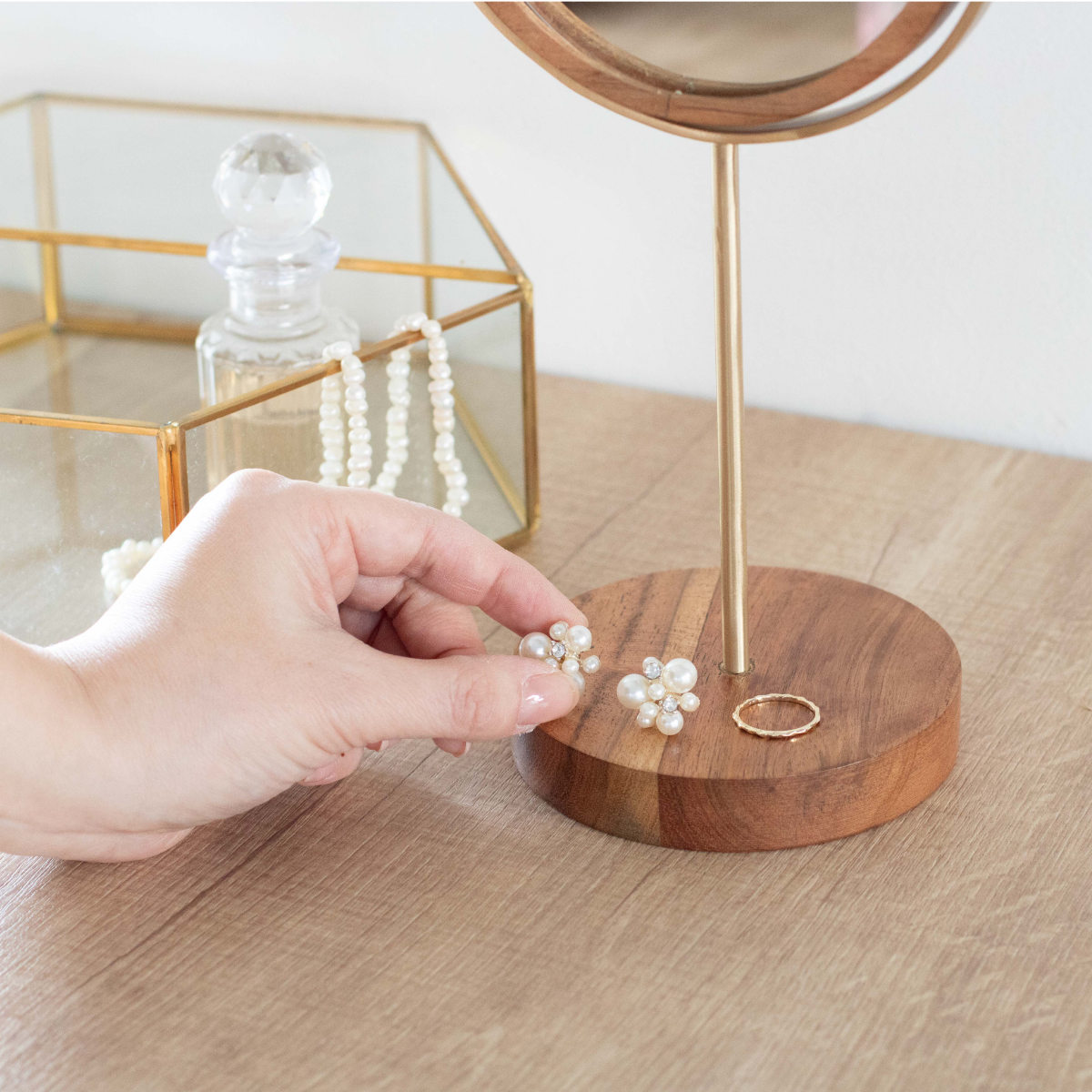 台座の上にはピアスやリングなどの小物を置くことができます。お気に入りのアクセサリーをさりげなく飾るように使えるのも魅力です。