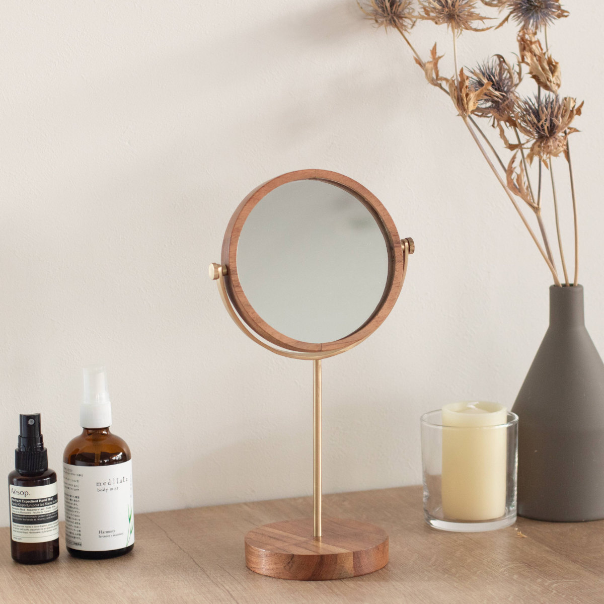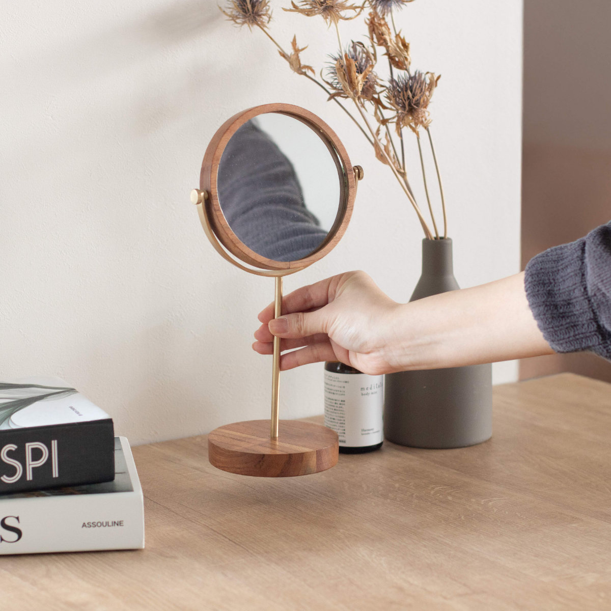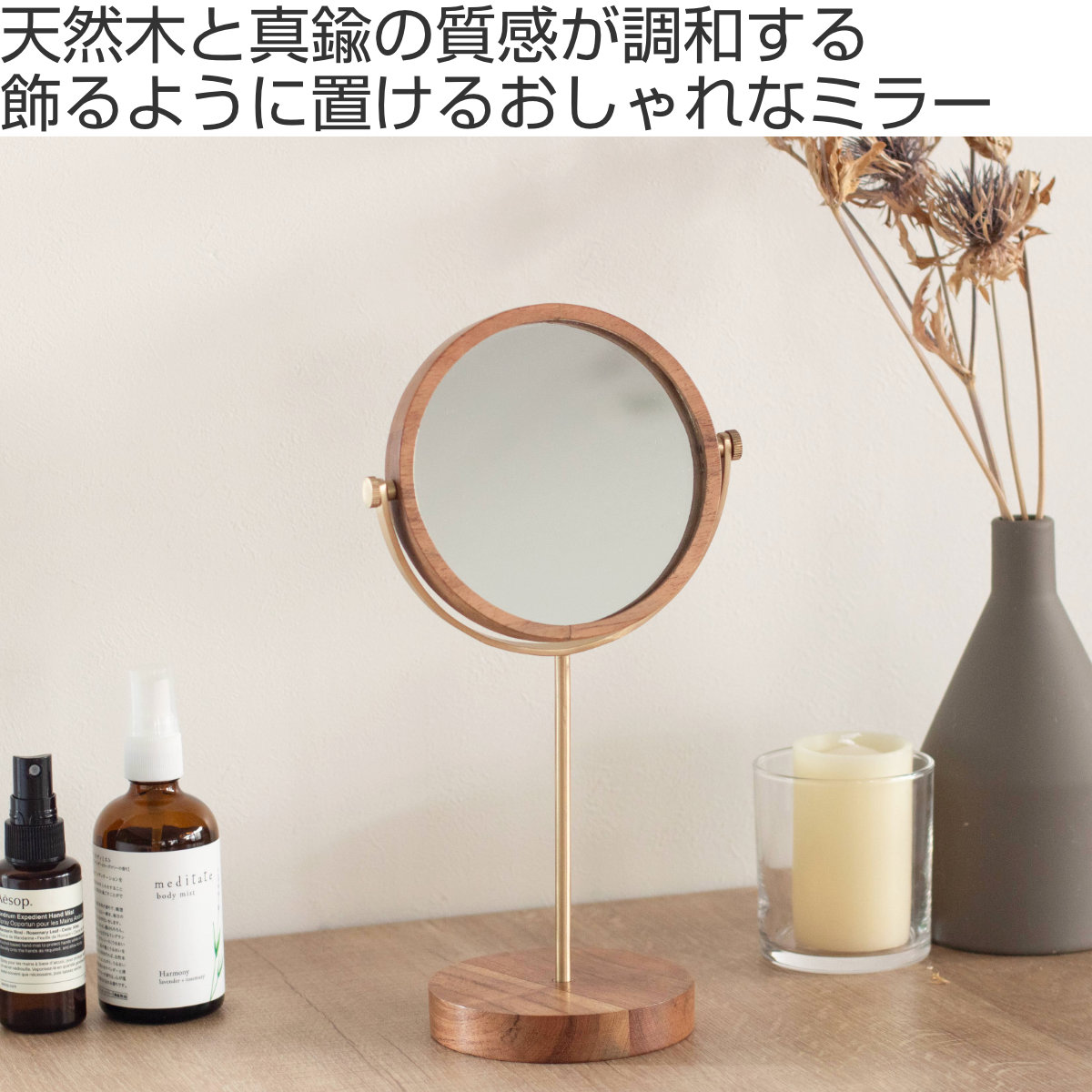 丸いミラーのフォルムと木と真鍮の質感が、お部屋にやわらかな印象を与えます。ドレッサーやデスクなど毎日のメイクスペースにもなじみやすく、ナチュラル、北欧、シンプルな空間にも合わせやすいデザインです。