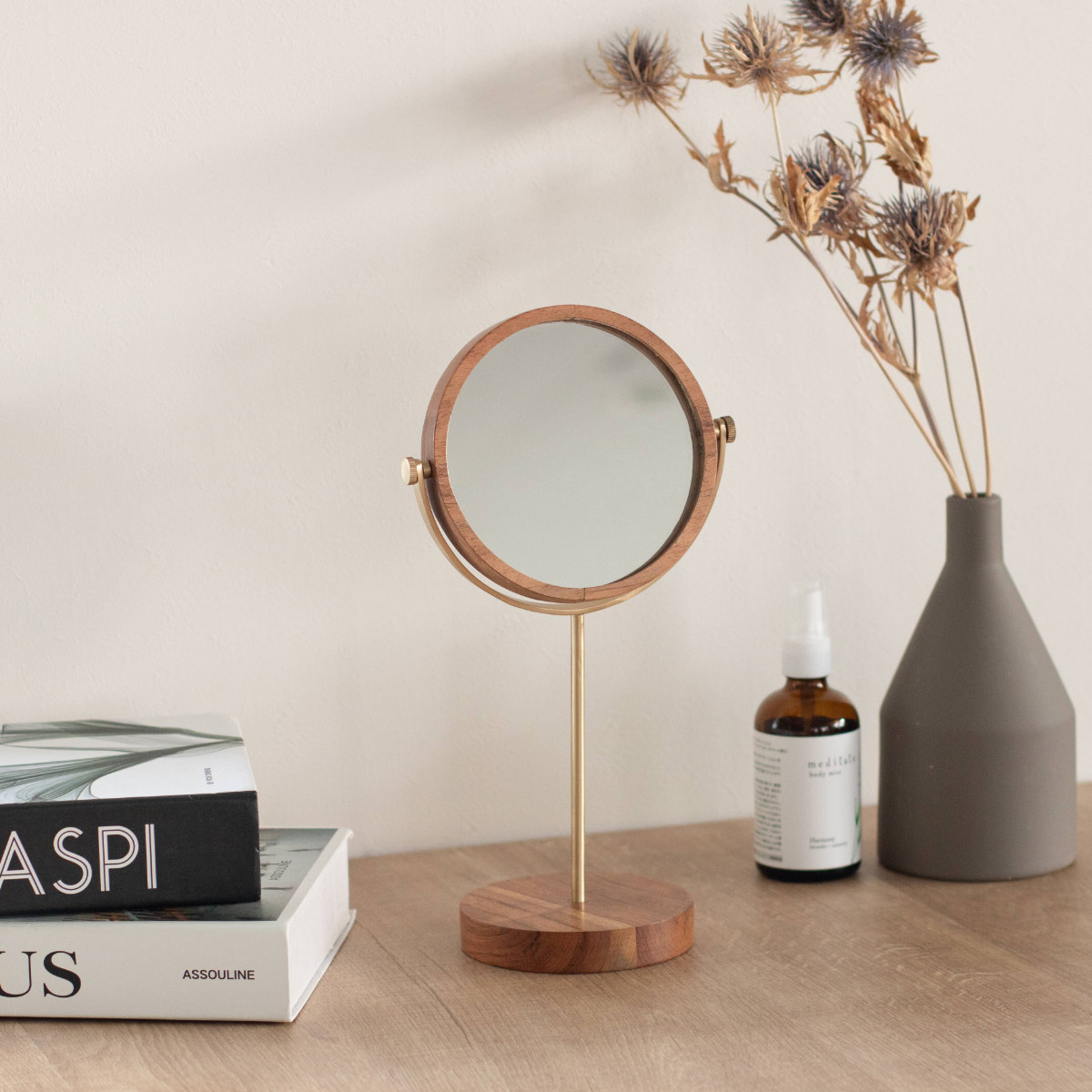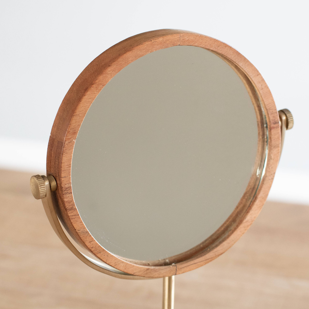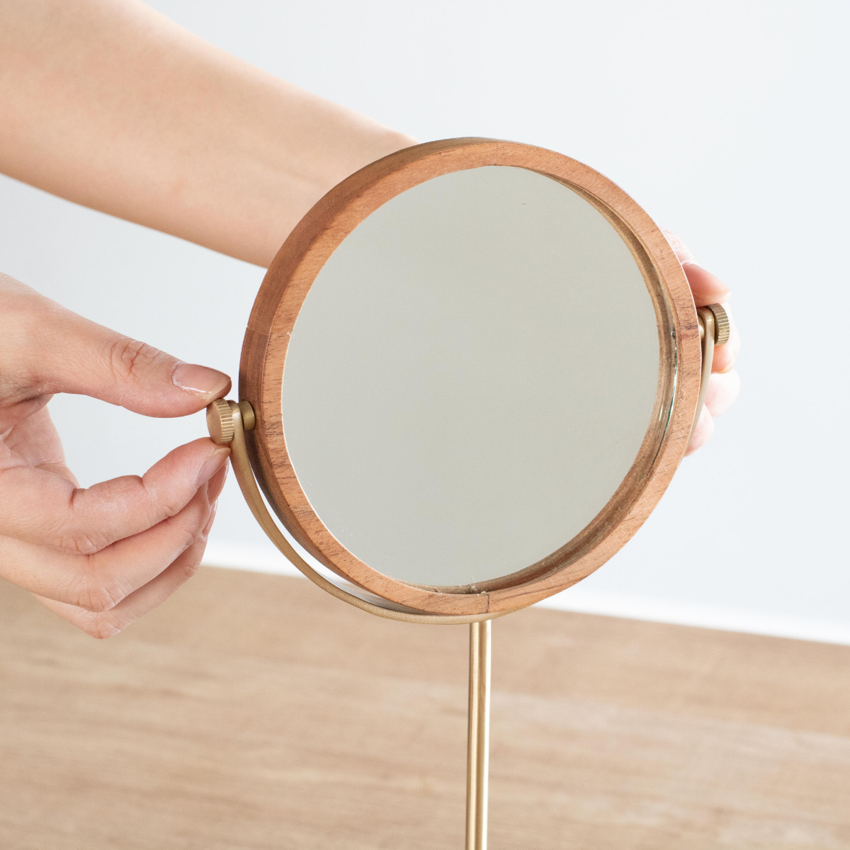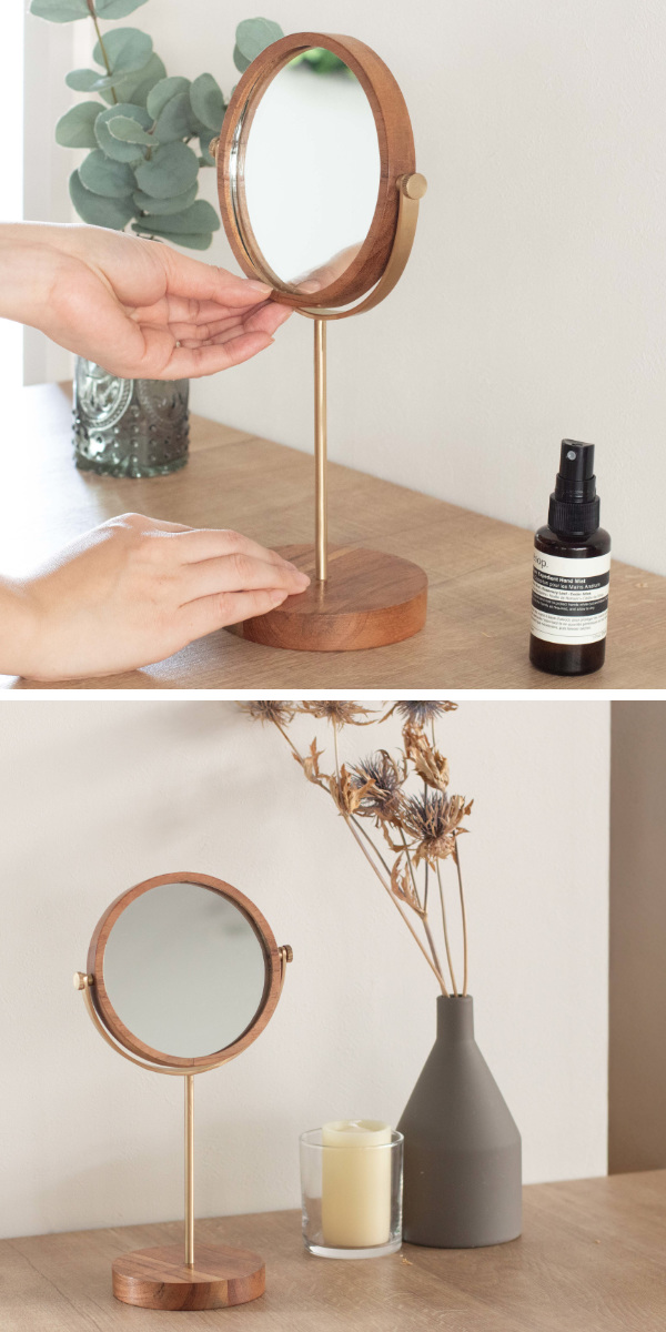 天然木のあたたかみと、真鍮の落ち着いた輝きを組み合わせたクラシカルな印象の卓上ミラー。異なる素材が引き立て合い、空間に自然となじむ上品な佇まいが魅力です。