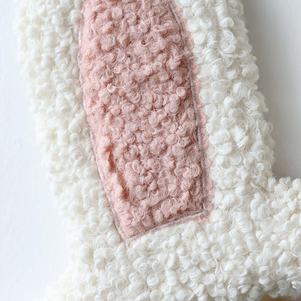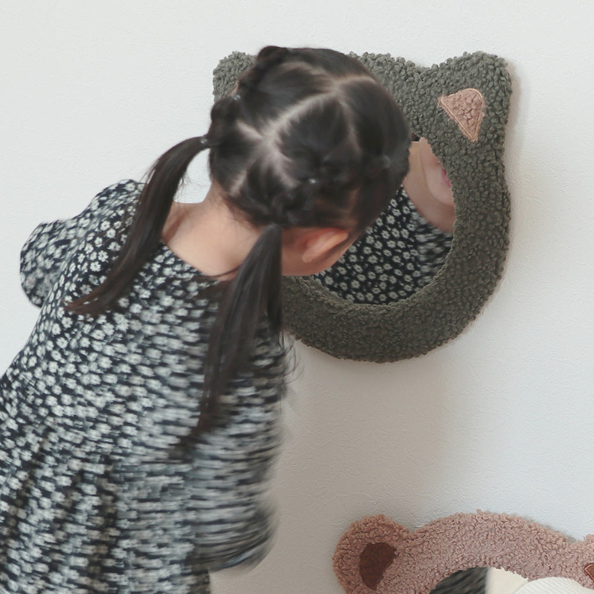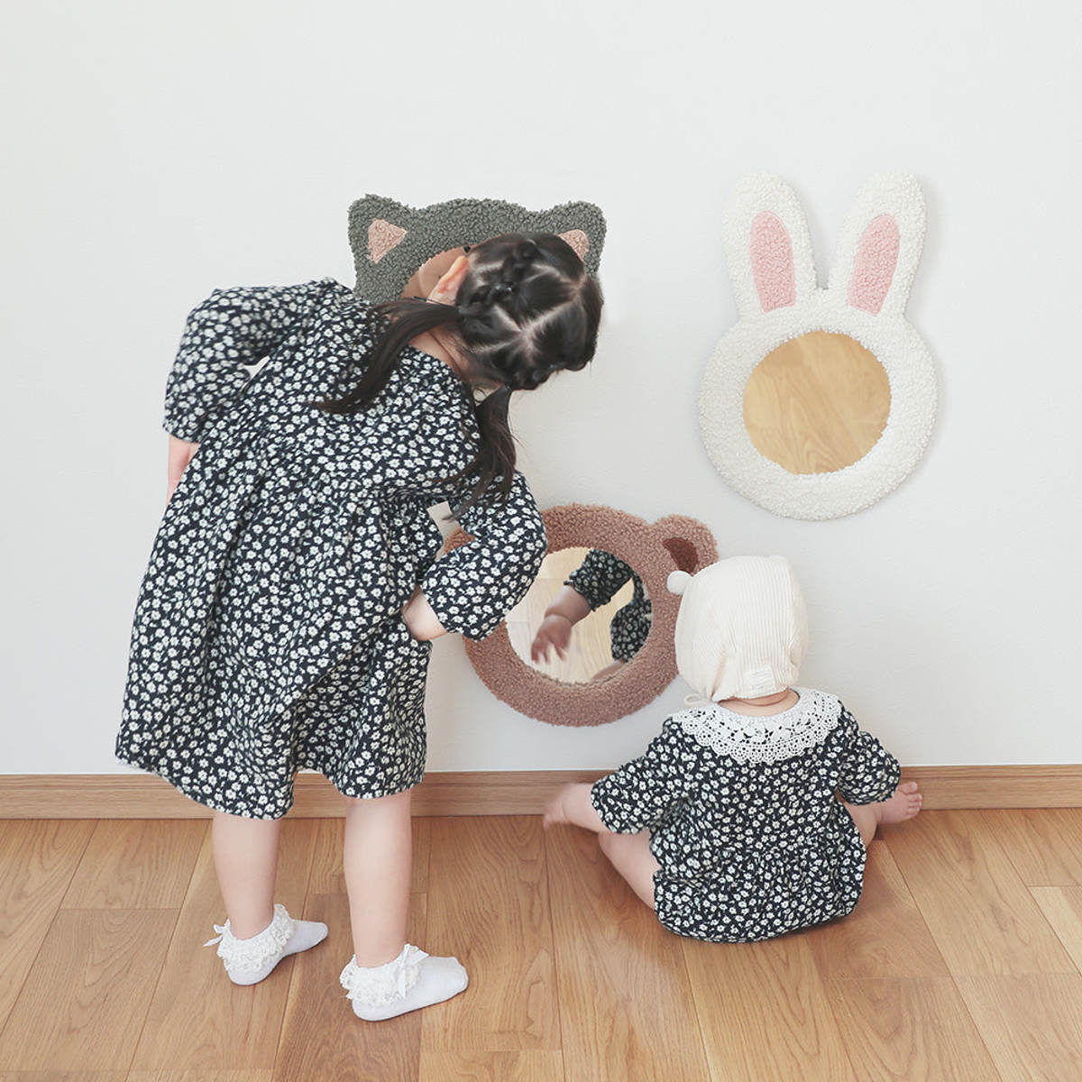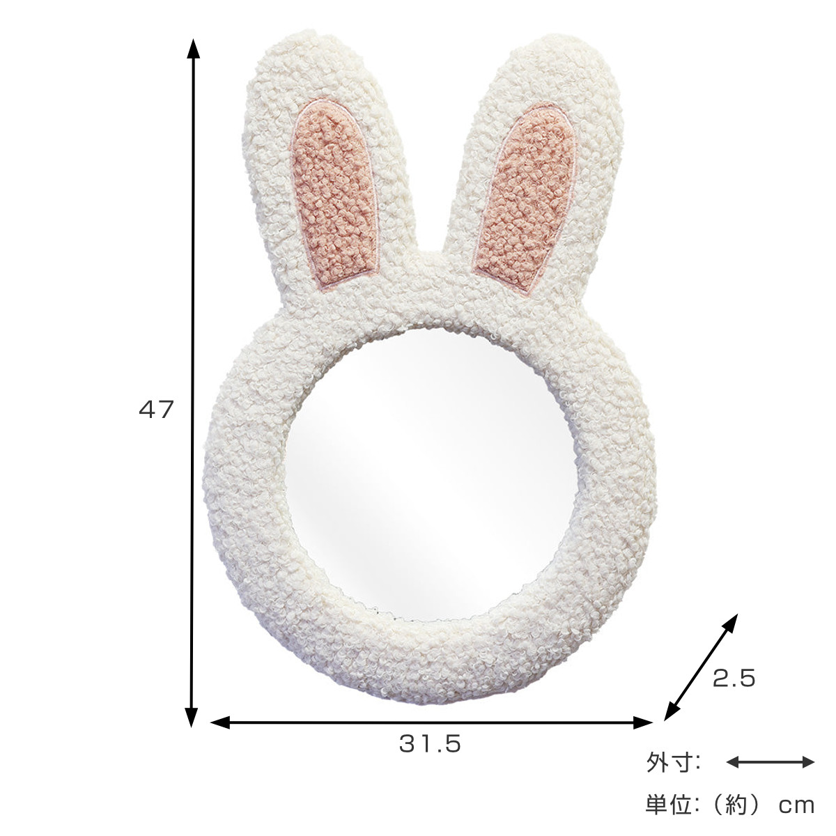 のぞきこむだけで、可愛いうさぎさんに変身。ふわふわのモコモコ素材で作られたバニー耳がキュートなウォールミラーです。柔らかいホワイト×やさしいピンクの配色がお部屋を明るくほっこりした雰囲気に。子どもが鏡を見る時間が楽しくなるアイテムです。