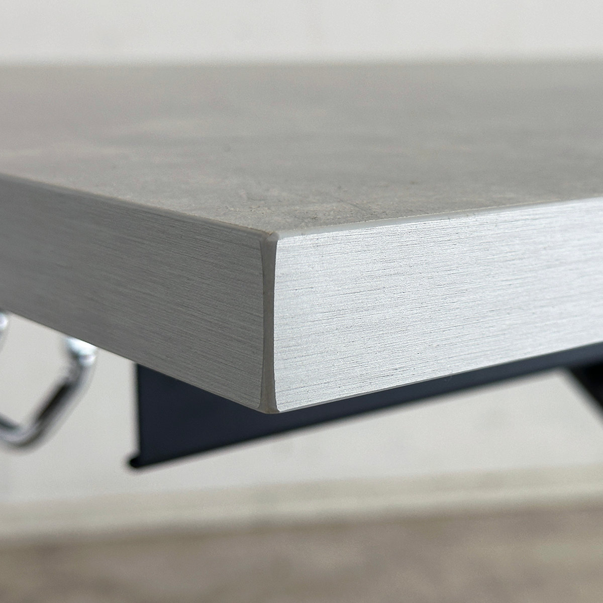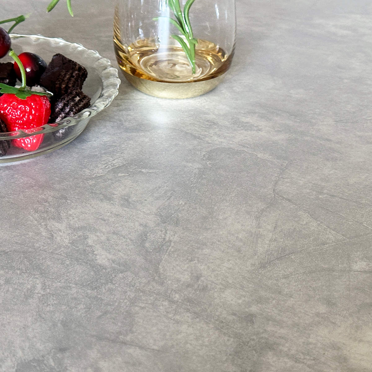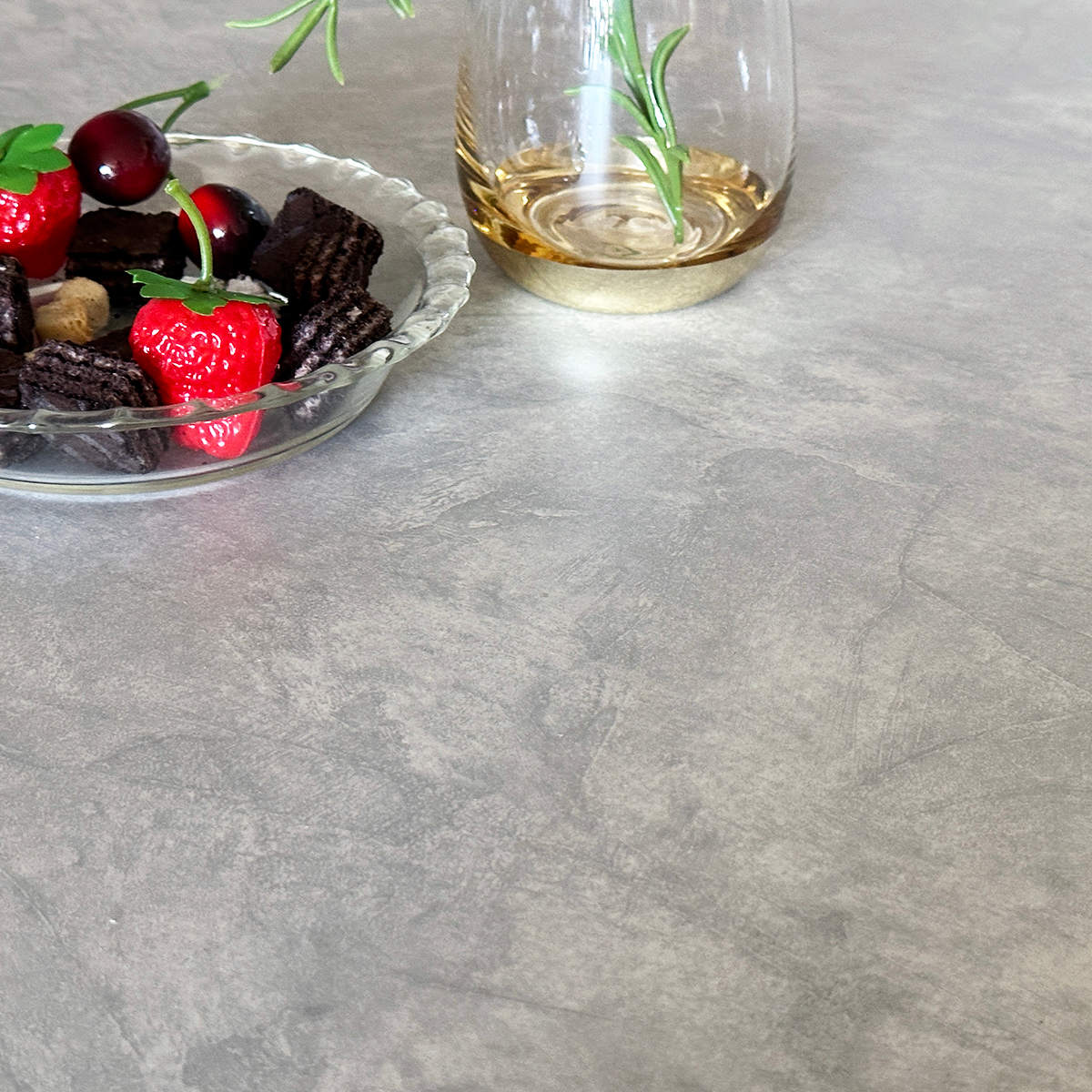 ライトグレーの柔らかい色味に、自然な石目模様が美しく映える天板。どんなテイストにも調和し、落ち着いたモダンな雰囲気を演出します。