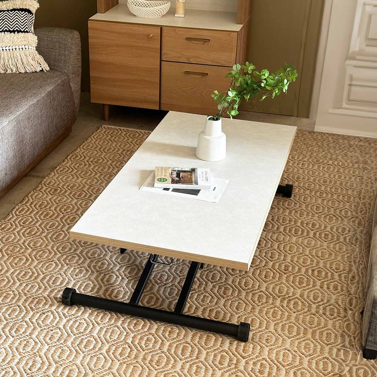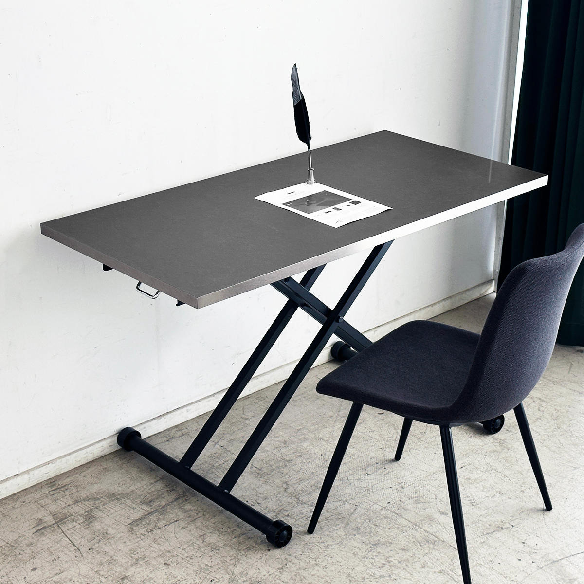 落ち着いたトーンの天板とブラックのスチール脚がモダンスタイルの昇降リビングテーブルです。北欧、モダン、ヴィンテージまで幅広いスタイルと好相性。部屋全体の雰囲気をぐっとおしゃれに仕上げます。