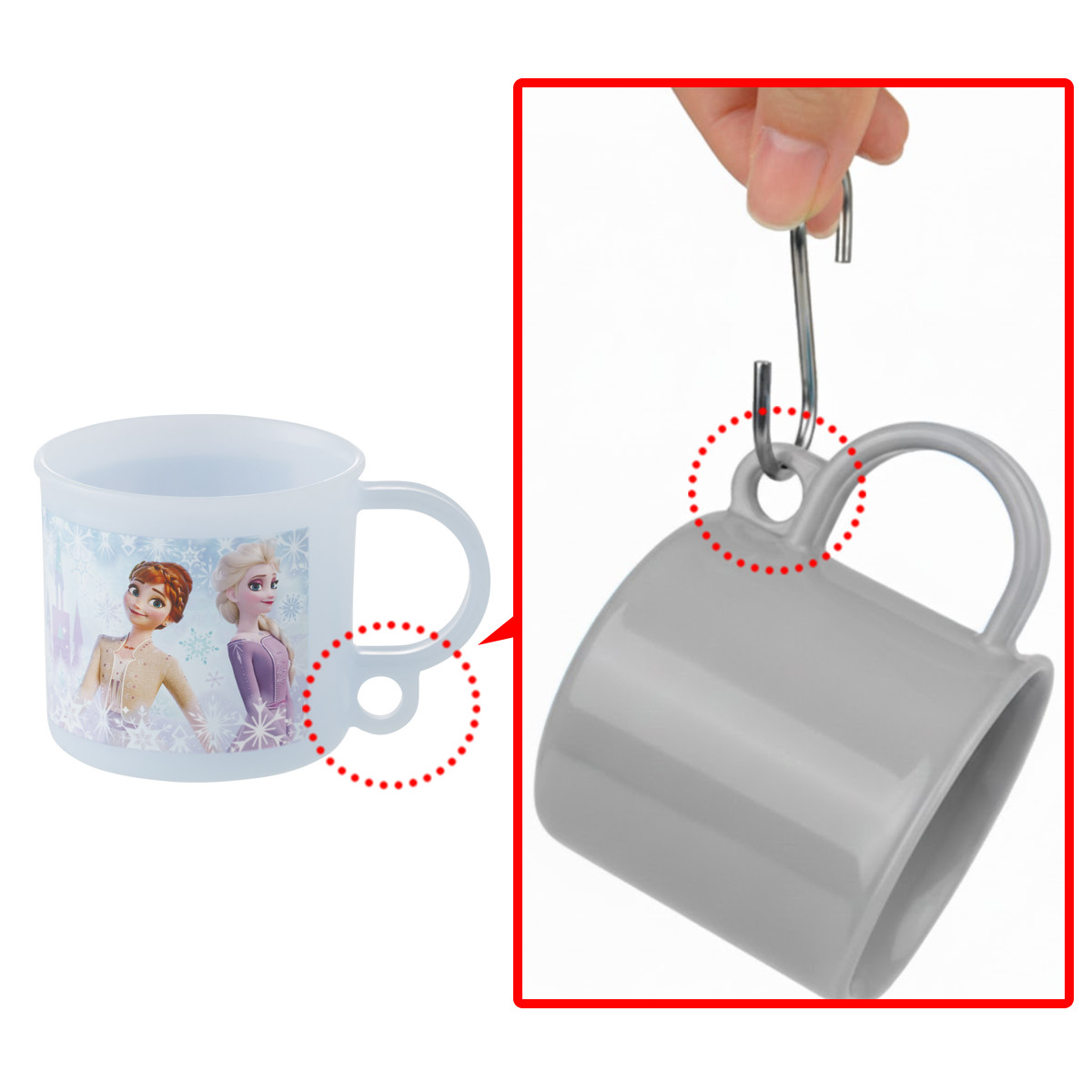 コップの持ち手の下にフックなどに掛けられる部分が付いているので、使用後や洗った後などに逆さにして吊っておけば、水切れが良くとても衛生的です。