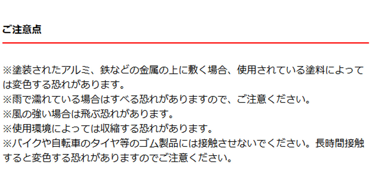 | 注意事項 | ※塗装されたアルミ、鉄などの金属の上に敷く場合、使用れている塗料によっては変色する恐れがあります。 ※雨で濡れている場合はすべる恐れがありますので、ご注意ください。 ※風の強い場合は飛ぶ恐れがあります。 ※使用環境によっては収縮する恐れがあります。 ※バイクや自転車のタイヤ等のゴム製品には接触させないでください。長時間接触すると変色する恐れがありますのでご注意ください。 |