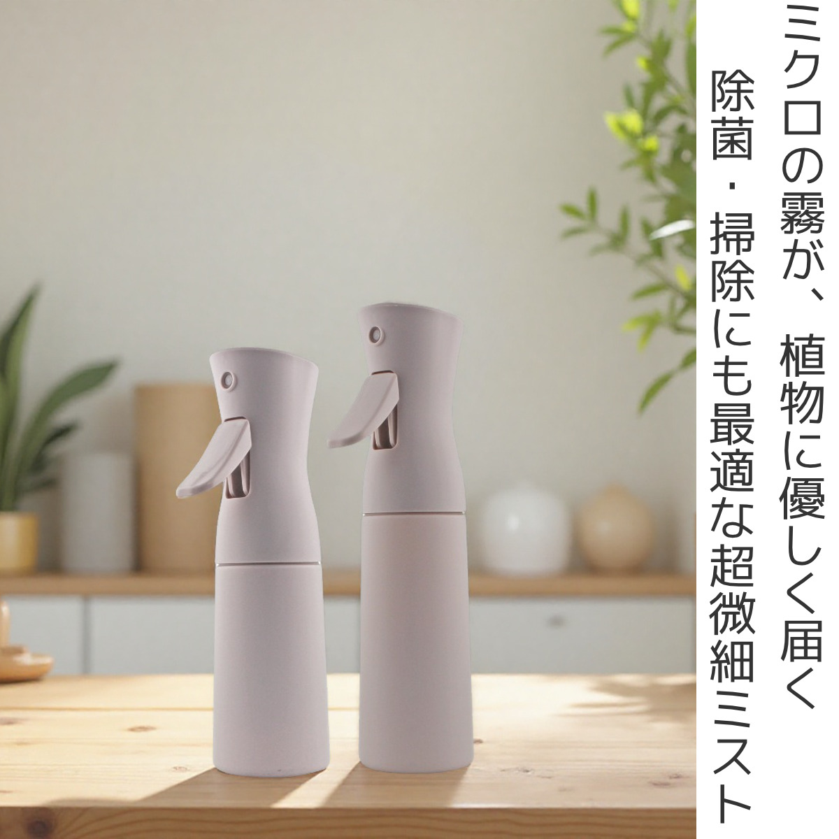 細かいミストを噴霧するスプレーボトルです。シックなマット系のデザインが美しく、お部屋の雰囲気に自然に馴染みます。植物の葉水ケアはもちろん、除菌や掃除にもこの1本で完了する便利なアイテムです。