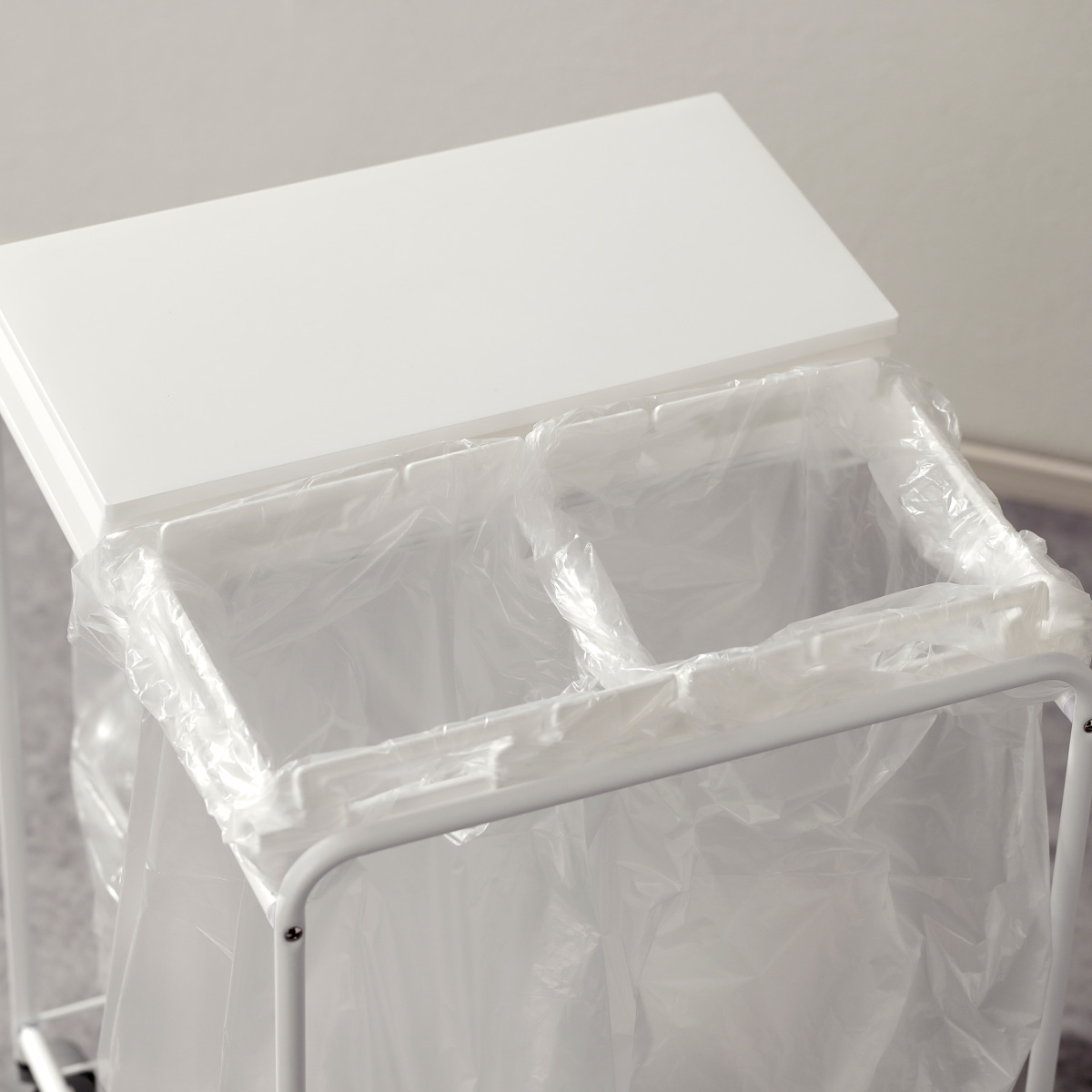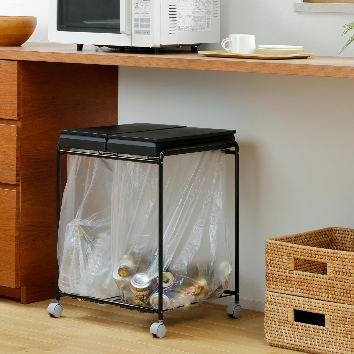 45Lのゴミ袋を使って2分別できるふた付きのフレームダストワゴンです。フレームだけのシンプルな構造とスリムで縦長のデザインが洗練された印象を与え、どんなお部屋にも馴染みます。