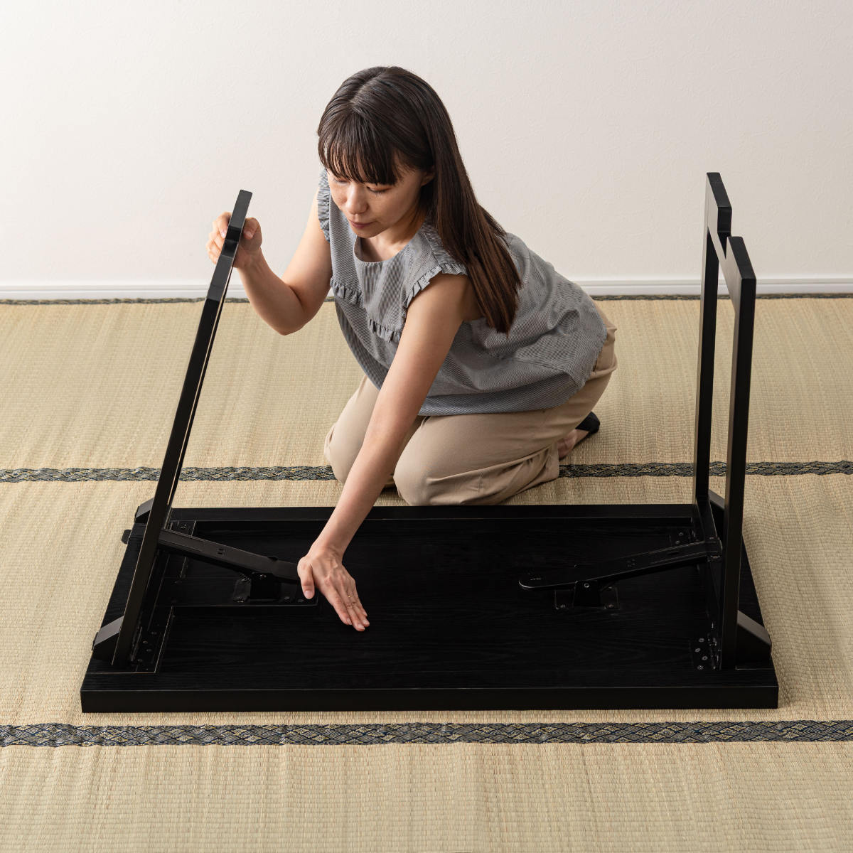 脚を立てればハイテーブルとして、折りたたんだ状態ではローテーブルとしてお使いいただけます。ひっくり返して金具を押しながら脚を倒すだけの簡単操作で、気軽に畳めます。使わない時にも省スペースで収納が可能です。