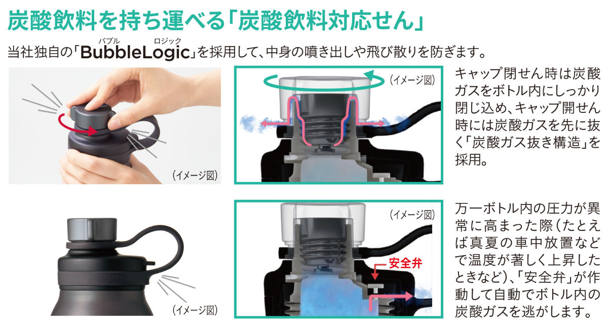 タイガー魔法瓶が独自に開発したBubbleLogic(バブルロジック)を採用しています。炭酸ガスの噴き出しを防ぐため、キャップ開栓時に作動する「炭酸ガス抜き機構」と、万が一、ボトル内の圧力が高まった異常時に作動する「安全弁」を備えています。